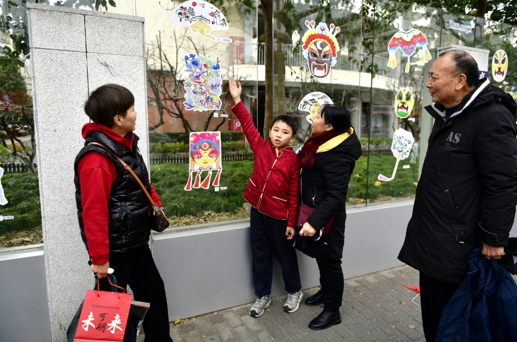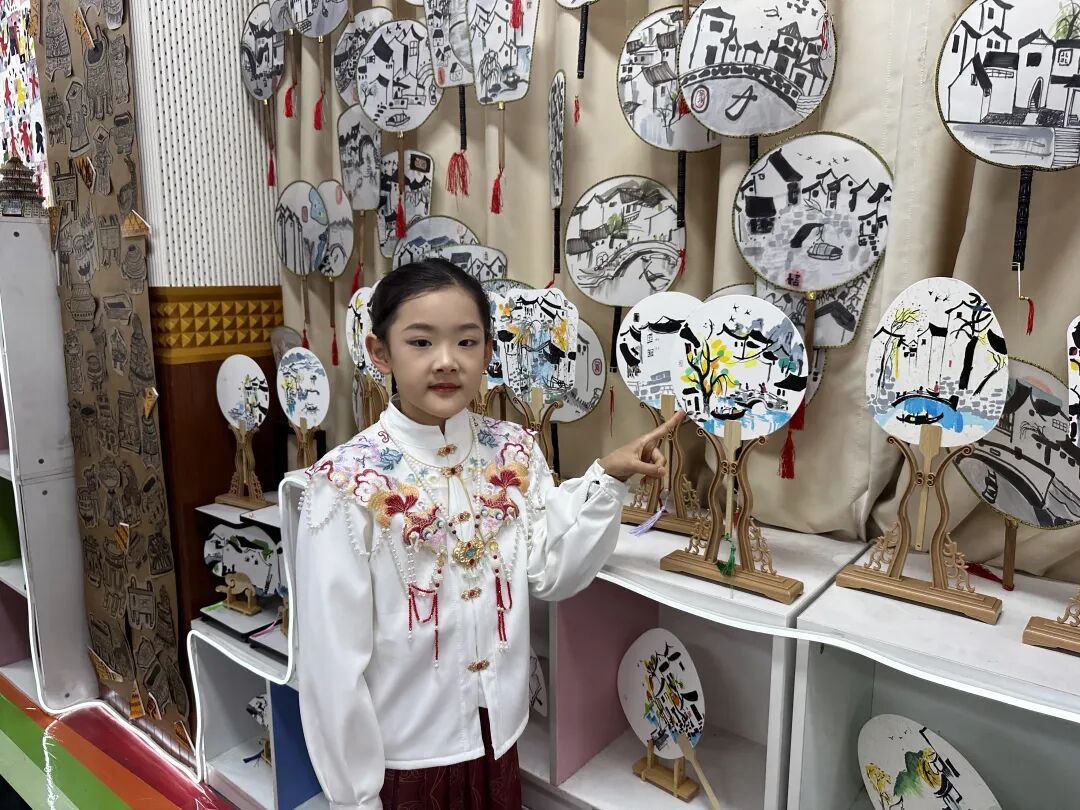 “这幅画临摹了吴冠中先生的《江南水乡》,画中有小桥、流水、人家……”近日,在莘庄镇小学南校区外一道200米长的透明围墙前,三年级学生刘谨睿向居民介绍自己的作品。这里已化身“露天美术馆”,陈列着学生的非遗艺术作品——五彩剪纸、憨态花馍、灵动扇面等,吸引不少路人驻足观看。