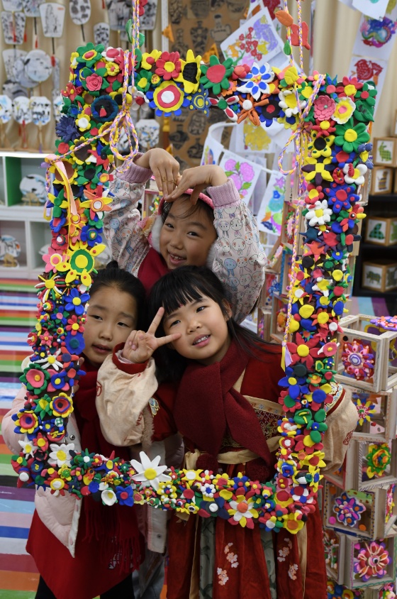 由一年级学生制作的花瓣泥塑拼接而成的巨幅相框,成为学生们最喜欢的打卡点,相框一旁则陈列了二年级学生作品的花馍泥塑。“我们在熟练练习花瓣泥塑制作后,可以做进阶版的花馍了,看起来是不是很美味?”二年级学生史若妤说道。