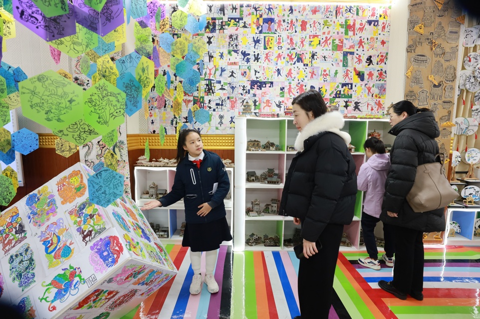 “往年会对参展作品进行筛选,但这次我们力求让全校每一个孩子的作品都有机会亮相。”校长薛琼介绍,学校不仅充分利用校内空间,更将精选作品延伸至校外,通过举办亲子观展活动、邀请市民参与作品评议等多元形式,主动将优质美育资源向周边辐射,积极构建“学校主导、家庭参与、社区支持”的协同育人格局。
