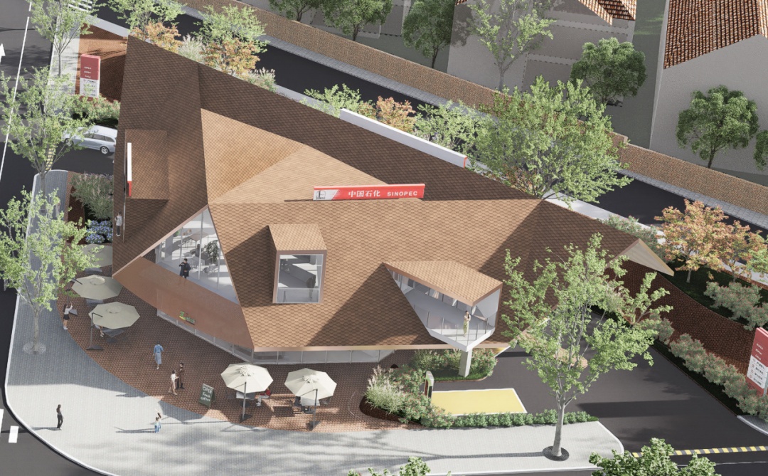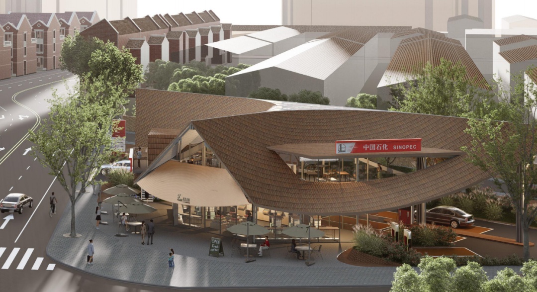打破传统加油站的封闭感,西侧绿化带形成自然生态分隔,有效消除加油站邻避效应,同时为社区新添景观街角花园,成为居民日常交往的延伸场所。