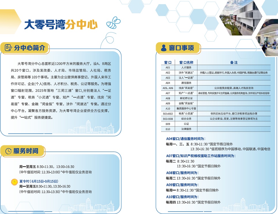 随着大零号湾“全方位科创服务体系”,2025年,区政务服务中心着眼“独角兽”“瞪羚”“小巨人”企业需求,增强窗口辐射范围,落地“三闵三通”——法人“一证通”专窗、税务“小灵通”专窗、知产“一点通”专窗、找房“闵易居”专窗、金融“闵金投”专窗、涉外“闵速达”专窗。