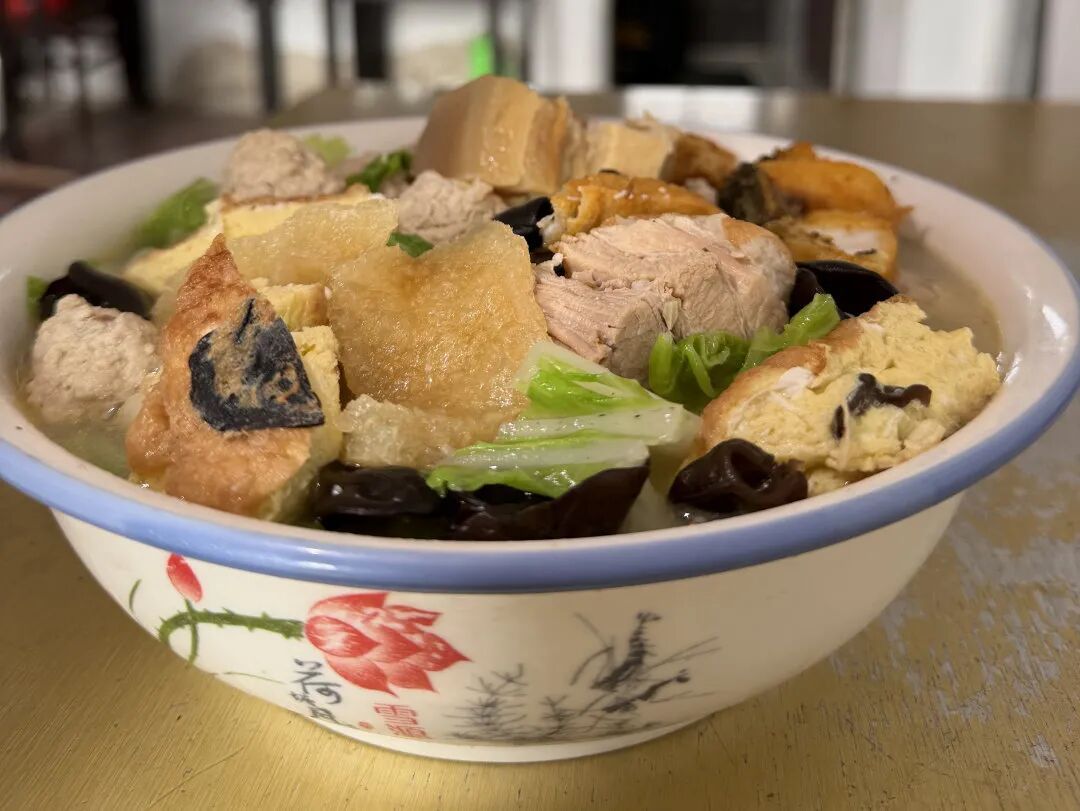 三鲜汤的精髓,在于食材的搭配。弹韧的肉皮吸饱汤汁,每一口都迸发鲜醇;手工制作的肉圆紧实软糯,藏着猪肉最本真的香;清甜的荸荠消解油腻,带来脆嫩口感;走油肉酥而不烂,油脂融入汤中,让鲜味更上一层;咸肉与白菜碰撞,咸鲜与清甜相互交织;金黄的蛋块吸满汤汁,每一口都饱含惊喜。