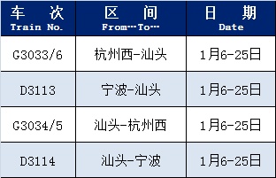 线路方向对应:恢复的车次是 “往返配对” 的(比如杭州西↔汕头、宁波↔汕头,各有去程+返程车次),满足双向出行需求。