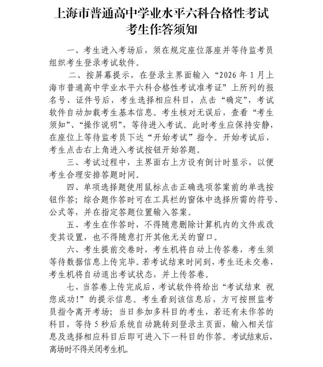 据市教育考试院介绍,2026年1月上海市普通高中学业水平六科合格性考试将于1月10日至11日举行。本次考试采用上机考试的形式,为确保考生顺利参加考试,特提醒以下注意事项。