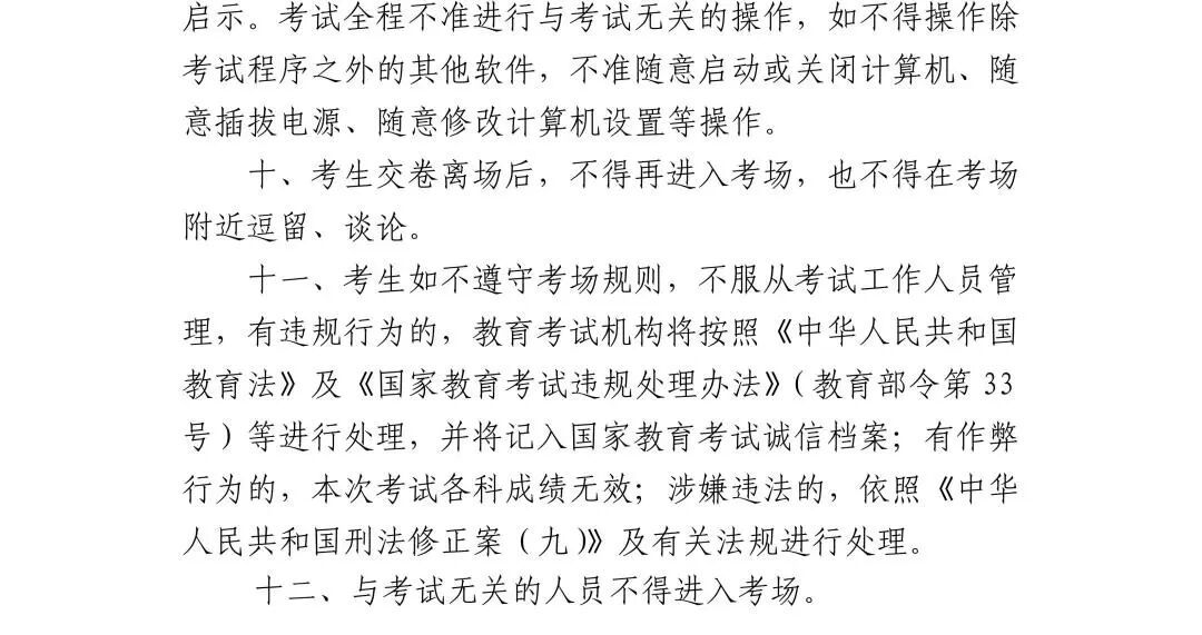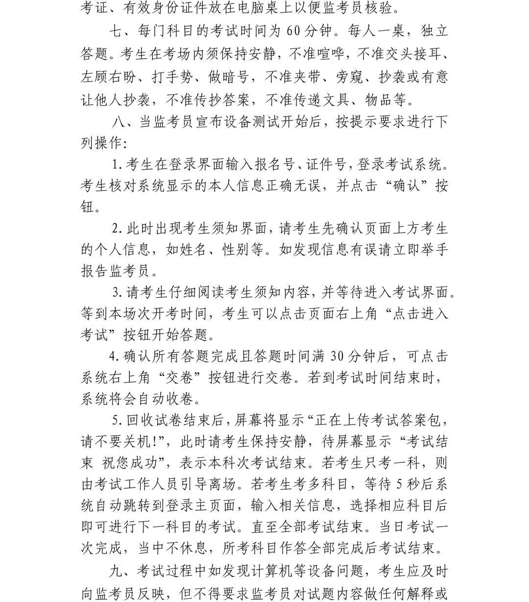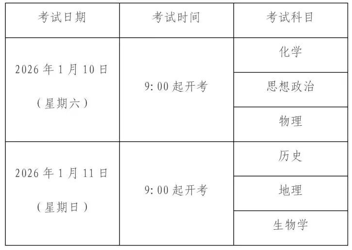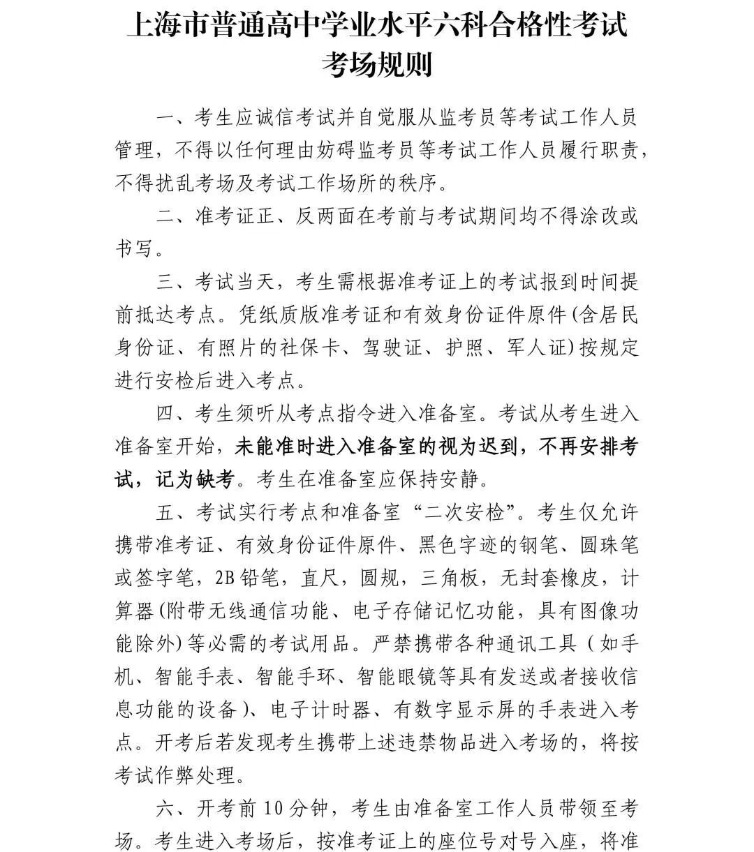 考试科目和时间安排如下: 注:具体考试时间以准考证为准。 注意事项 做好考试准备 1.带齐两证赴考。考生须凭本人当天考试科目准考证和有效身份证件原件(含居民身份证、有照片的社保卡、驾驶证、护照、军人证),严格按照准考证上的规定时间和考点参加考试,请仔细阅读准考证上的说明和要求,妥善保管好准考证,考前和考中均不得在准考证正反面做任何标记。 2.早出门勿迟到。请广大考生和家长充分考虑考试期间的交通、天气等因素,合理规划赴考时间,考前45分钟开始有序进入考点,配合考试工作人员完成考点入口处的安检工作。考试从考生进入准备室开始,未能准时进入准备室的视为迟到,不再安排考试,记为缺考。 3.健康参加考试。请考生注意自我防护,避免生病、受伤。如有水痘、肺结核等传染病或考前突发临时情况,主动向所在学校报告(社会考生向区招考机构报告),并按照各区、考点统一安排参加考试。 严格遵守考试规则 1.配合安全检查。本次考试实行考点和考场(准备室)“二次安检”,为方便快速通过安全检查,请考生事先准备透明文具袋、透明资料袋,携带考试必需的文具等考试用品。 严禁携带各类通讯工具和作弊器材进入考点,如手机、智能手表、智能手环、智能眼镜、蓝牙耳机、翻译笔等。建议将手机放于家中或交由送考教师、送考家长保管。 有数字显示屏的手表、电子计时器、录放设备、涂改液(修正带)、不透明或带有标签的水杯(瓶)等用品禁止带入考场。计算器(附带无线通信功能、电子存储记忆功能,具有图像功能除外)可带入考场。 经申请并获批准的残疾考生所携带的助听器、人工耳蜗、拐杖、轮椅等可经检查后正常通过安检。 请考生听从考点工作人员管理,共同维护考点工作秩序和安全。 2.诚信参加考试。考试期间,教育、公安、网信、无线电管理等部门将对考场内及周边环境进行整治,对涉嫌利用通讯工具作弊人员进行严肃查处,涉嫌犯罪的追究刑事责任。考生须认真阅读并自觉遵守六科合格性考试《考场规则》和《考生作答须知》,诚信考试。作弊和违规行为将按《刑法》《教育法》《国家教育考试违规处理办法》《最高人民法院 最高人民检察院关于办理组织考试作弊等刑事案件适用法律若干问题的解释》严肃处理。