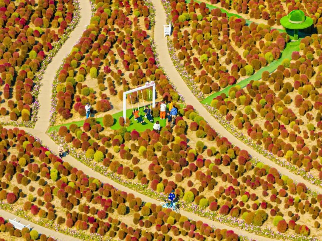 2025年11月下旬,在金山朱泾花开海上生态园,30万株成簇的地肤草在乡野大地上晕染出深红与嫩黄,似打翻的调色盘铺展在田野间。从高空俯瞰,缤纷色块与游客的欢声笑语构成一幅鲜活的秋之织锦。
