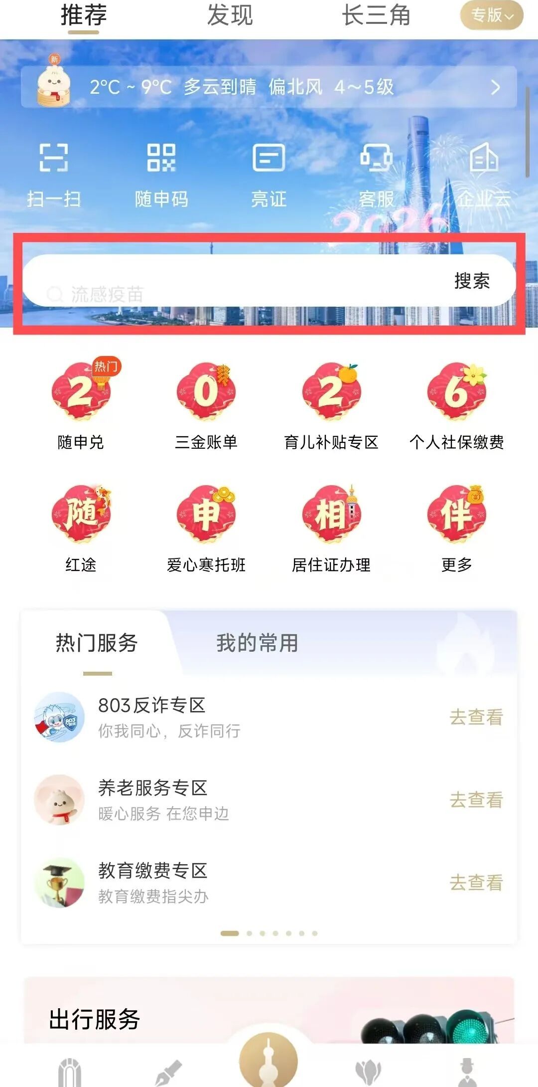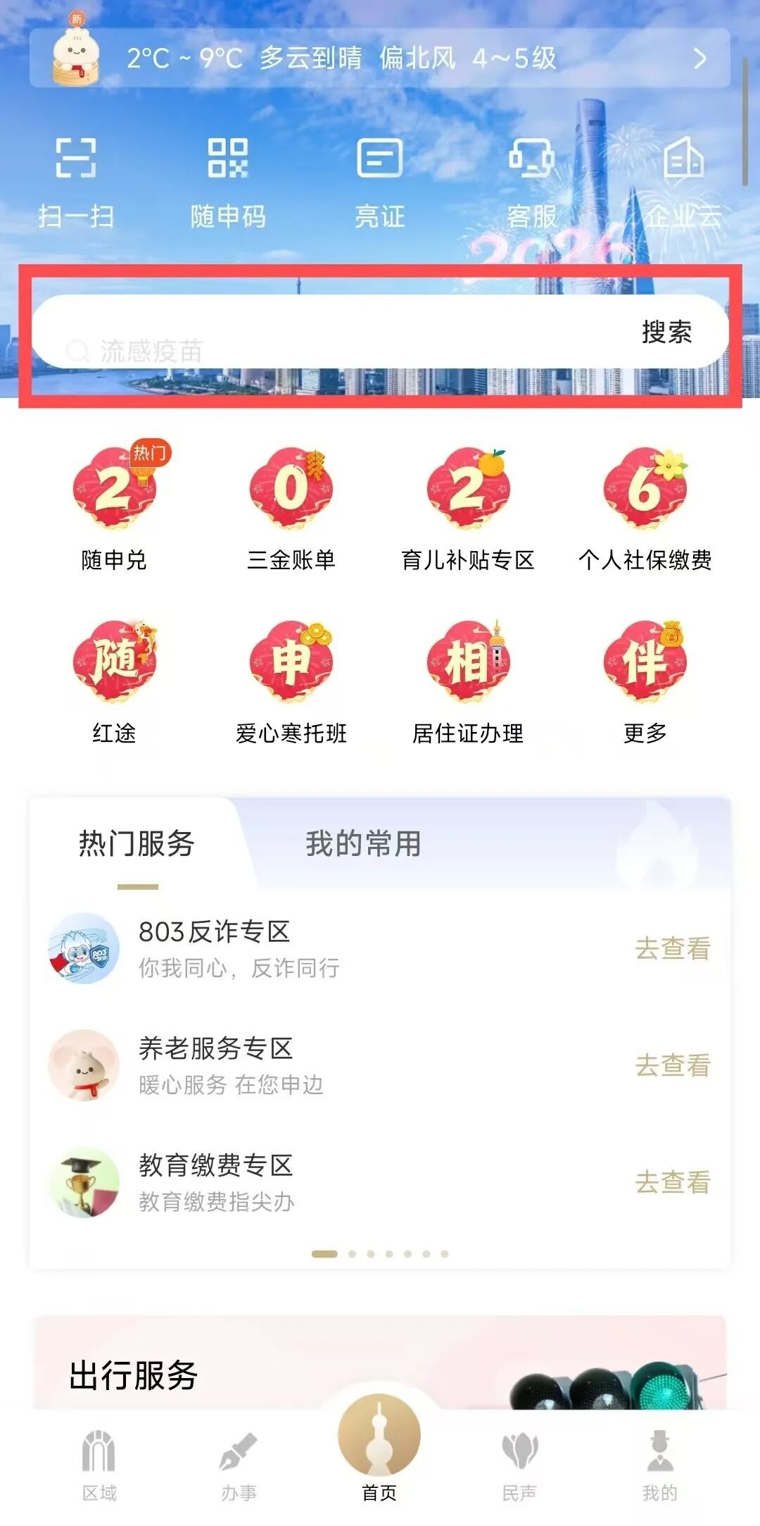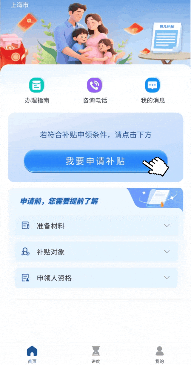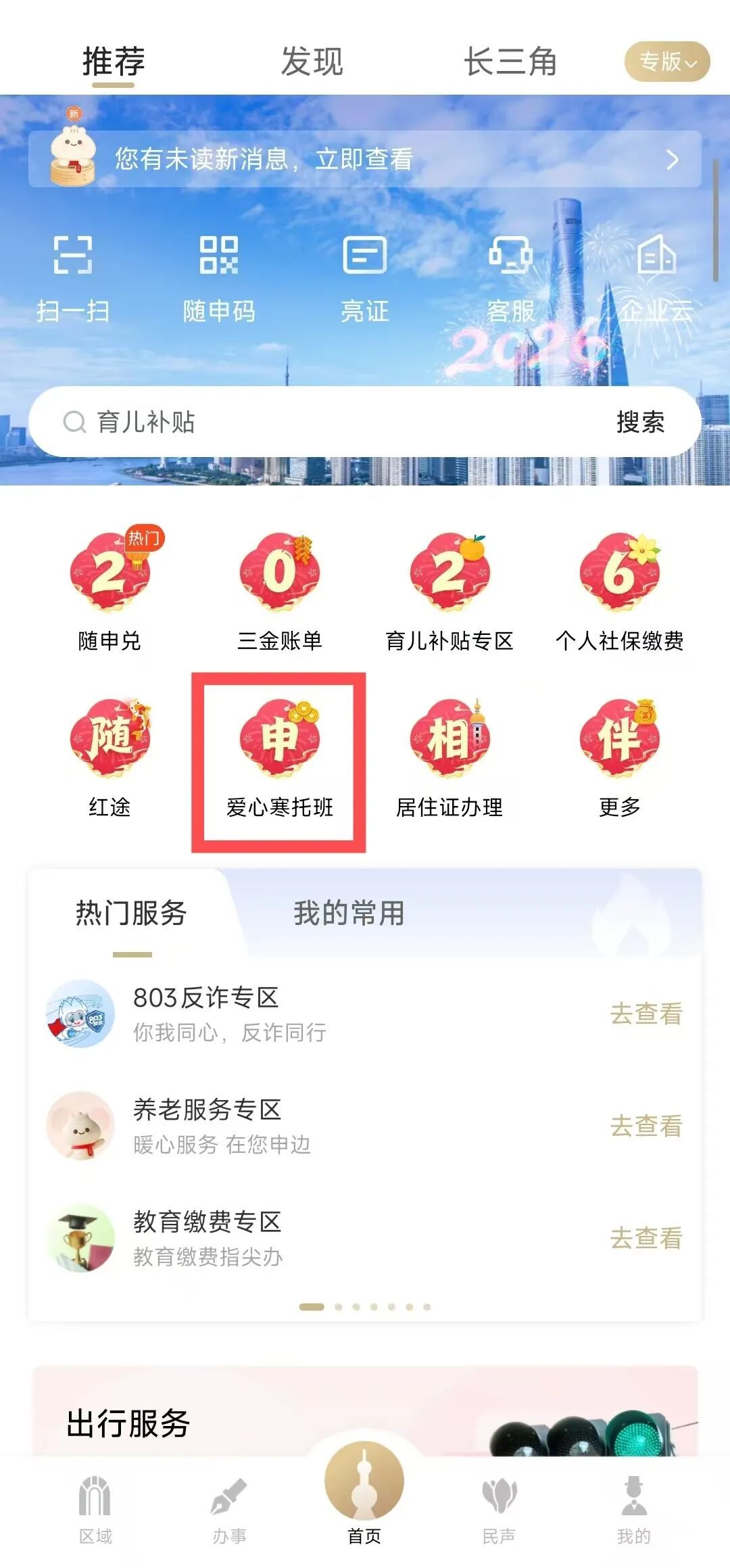 1、打开“随申办市民云”(APP/微信小程序/支付宝小程序),首页点击“育儿补贴专区”前往申领。