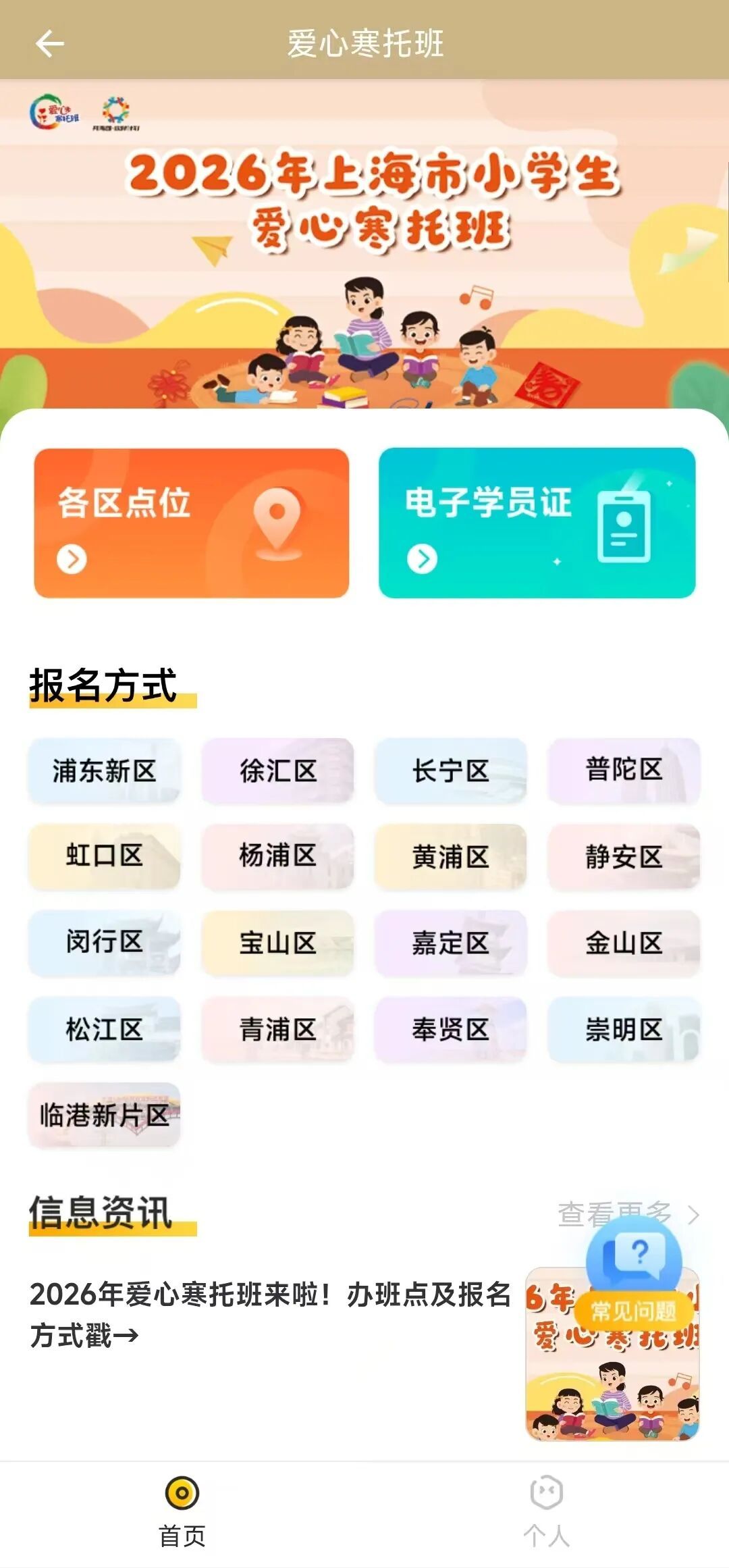 上海市小学生爱心寒托班报名即将开启,具有上海市小学学籍的学生可以通过“随申办市民云”(APP/微信小程序/支付宝小程序)首页点击爱心寒托班图标进入专区查看资讯,或者通过搜索框搜索进入您所在区的区旗舰店进入专区报名。