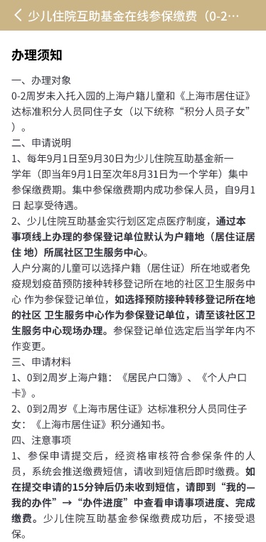 每年9月1日至9月30日,0-2周岁未入托入园的本市户籍儿童和《上海市居住证》达标准积分人员同住子女,以及托幼机构、中小学校(含中专、技校、职校、特殊学校)的在籍在册且学校已上传个人基本信息的学生(儿童),可进行自助参保登记与缴费。