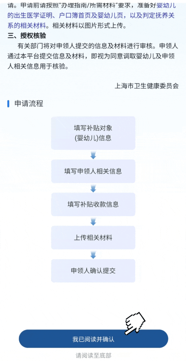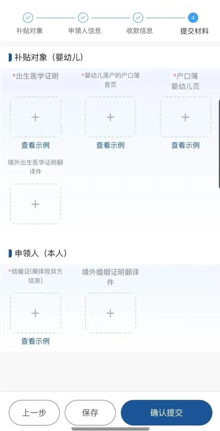 7、按页面提示上传婴幼儿(补贴对象)的出生医学证明、户口薄首页及婴幼儿页,以及判定抚养关系的相关材料,确认提交后等待审核结果。