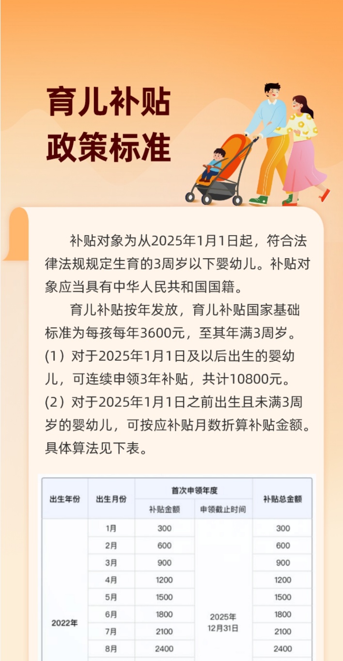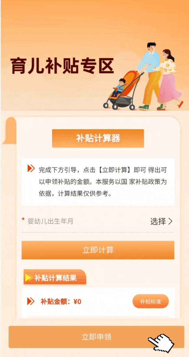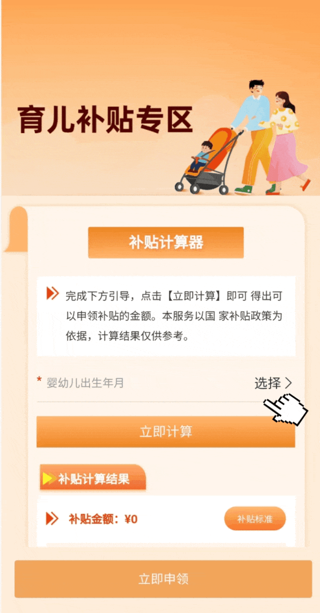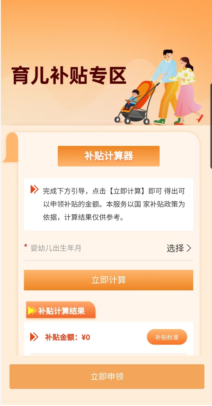 2、进入专区页面后,输入宝宝的出生年月,即可通过“补贴计算器”快速计算补贴金额,还可一键查看相关补贴政策标准。