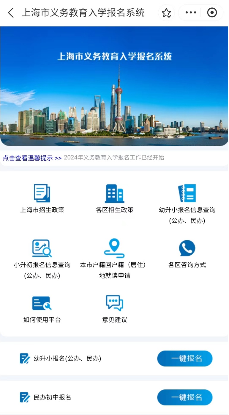 义务教育入学报名:登录“随申办市民云”(APP/微信小程序/支付宝小程序)搜索关键词“入学报名”,即可进入“入学报名系统”,查询、办理上海市招生政策、各区招生政策、幼升小报名信息查询(公办、民办)、小升初报名信息查询(公办、民办)、本市户籍回户籍(居住)地就读申请、各区咨询方式、幼升小报名(公办、民办)、民办初中报名等事项。