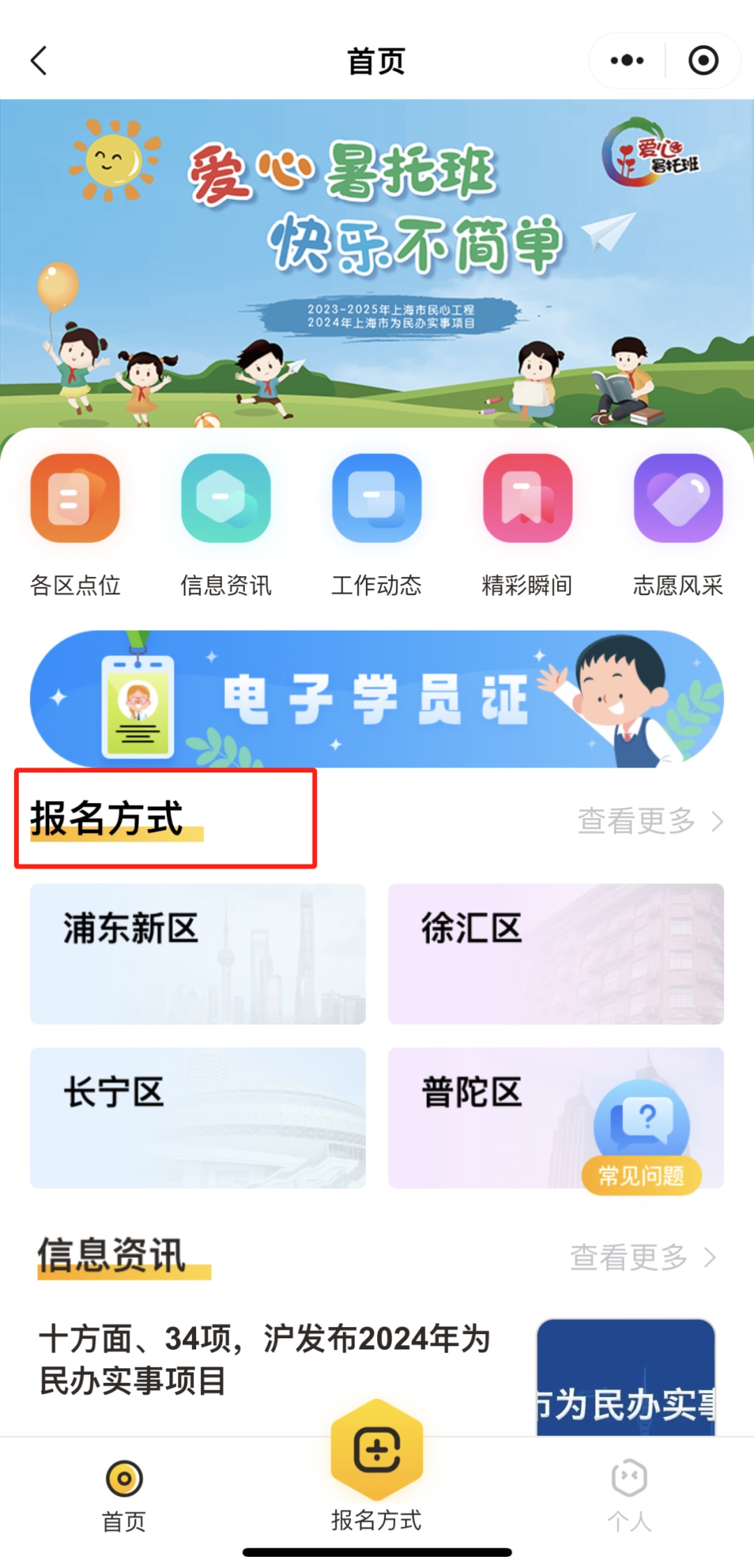 登录“随申办市民云”(APP/微信小程序/支付宝小程序),首页搜索点击“爱心暑托班”,在“报名方式”下即可查看报名,到了规定的报名时间还可以通过随申办市民云线上报名。
