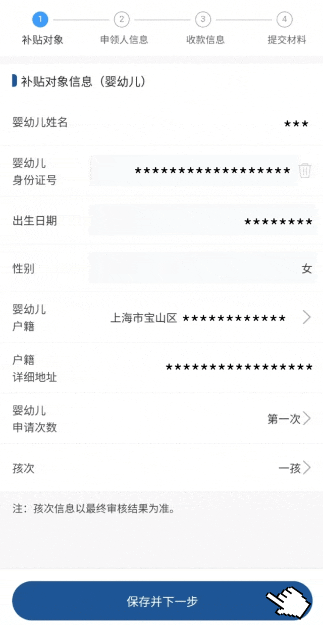 4、完善补贴对象信息,确保婴幼儿个人信息准确无误后,点击“下一步”。