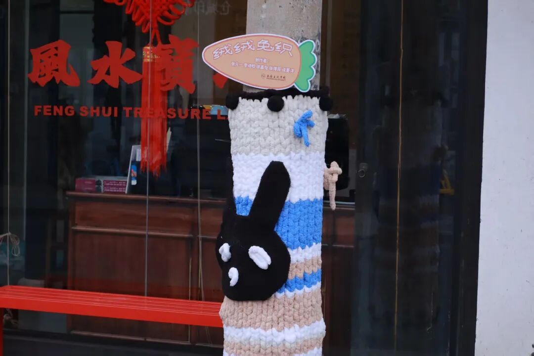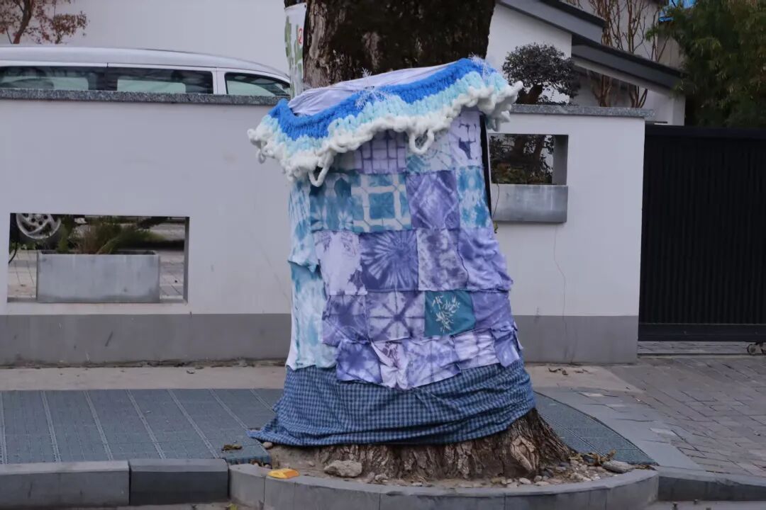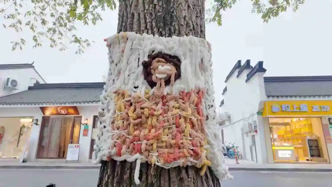 经过近一个月的设计编织,街边的大树陆续换上“新装”。幼儿园门口,毛线和不织布制成的考拉环抱着树干;咖啡店旁,大树展开“粉色双臂”,“呵护”怀中的洁白“小羊”;松江布展示馆附近,树木披上了蓝白拼布“外衣”,简约典雅。