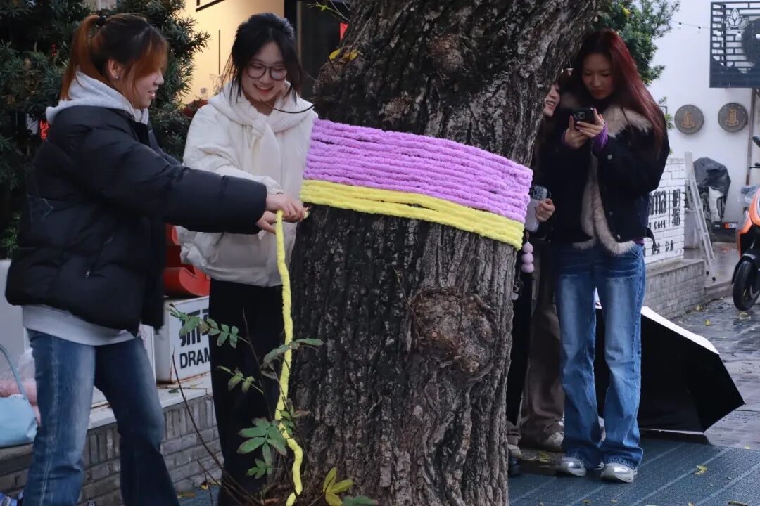 一针一线,皆有心意。学生们选用环保柔软的再生材料,运用多样针法精心编织,既为老树御寒,也不会对树木生长增添负担。这些“毛衣”不仅是艺术品,更是传统手工与现代创意、青年行动与社区关怀的温暖联结。