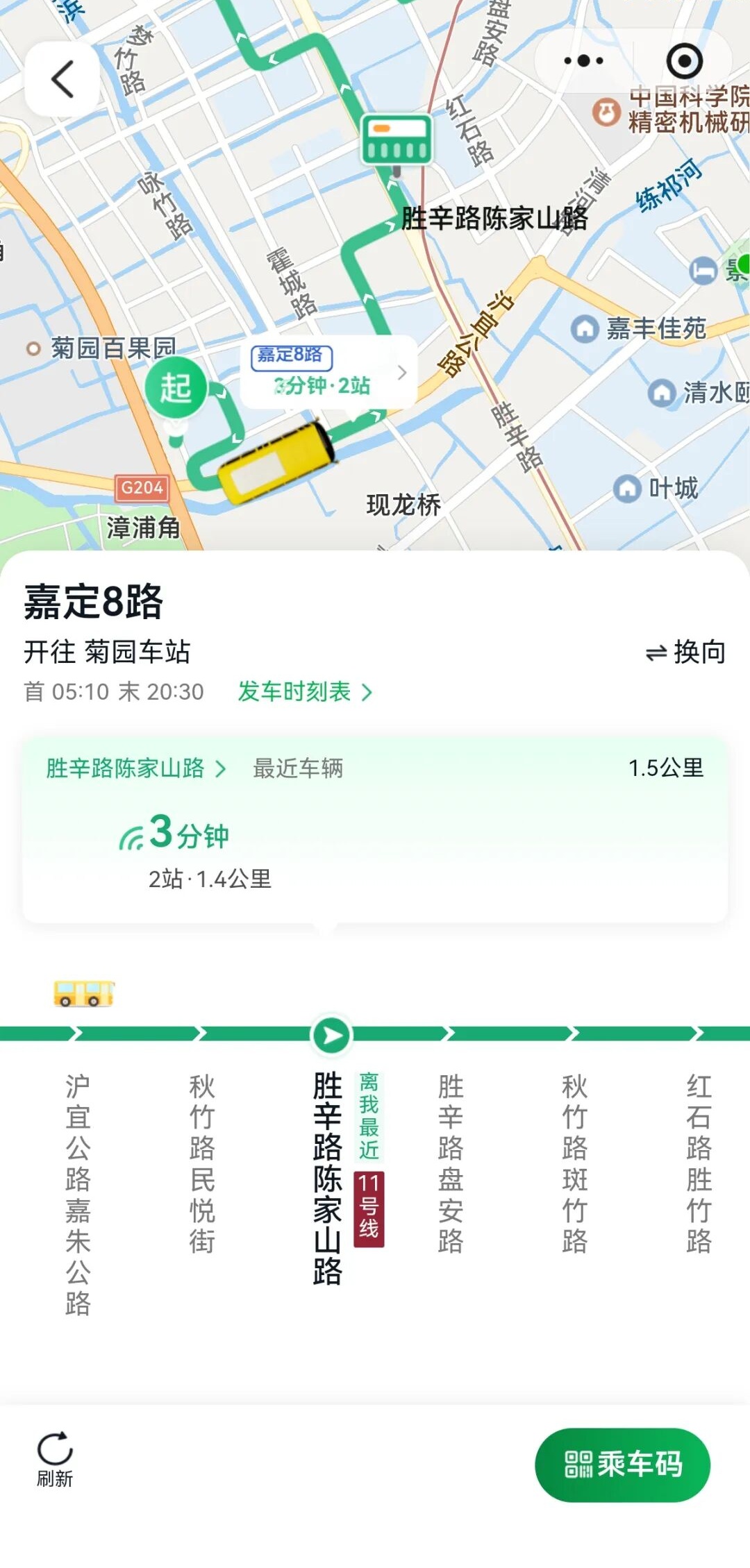 市民最关心的中途站公交实时到站时间查询,在“随申行”上也已实现。“譬如我们现在身处平城路秋竹路站,点击该站点后,界面会实时提示最近一班车距离本站的站数、距离和到站时间。”贾子健介绍。