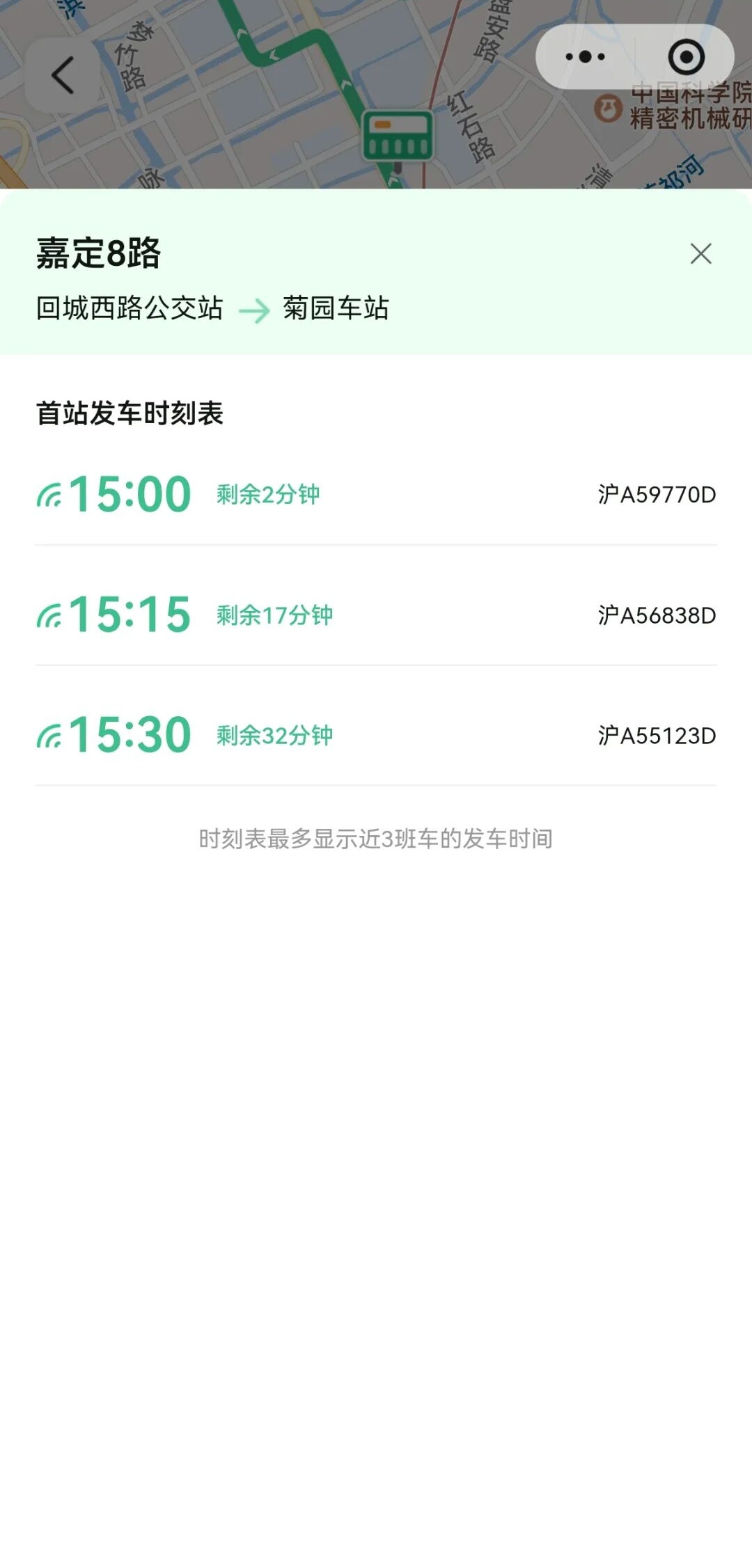 嘉定公交公司信息监管中心副主任贾子健介绍,目前,嘉定公交的信息查询功能已经接入“随申行”小程序。“通过微信或者支付宝进入小程序后搜索‘随申行’,找到‘实时公交’,系统便会自动显示离您最近的公交线路。”贾子健以公交嘉定8路举例,“点开相应的线路详情,在线路名称旁还可查看发车时刻表,了解最近2-3个班次的发车时间。”