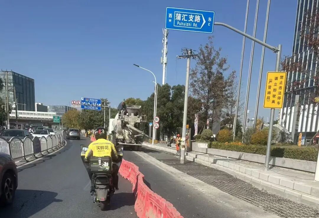 为切实改善这一情况,九亭镇规建办对沪亭南路(蒲汇路口以北)桥接坡路段进行了拓宽,并拆除了蒲汇路口以南路段的部分机非分隔带,增设进口车道,提升整体车辆通行承载力。为有效规范车流秩序,恢复T型交叉口通行模式,工程还拆除了中央隔离护栏,取消原右进右出的管制方式,同步增设交通信号灯。同时,对蒲汇路近交叉口路段进行重新渠化,科学划分车道,匹配实际车流通行需求。
