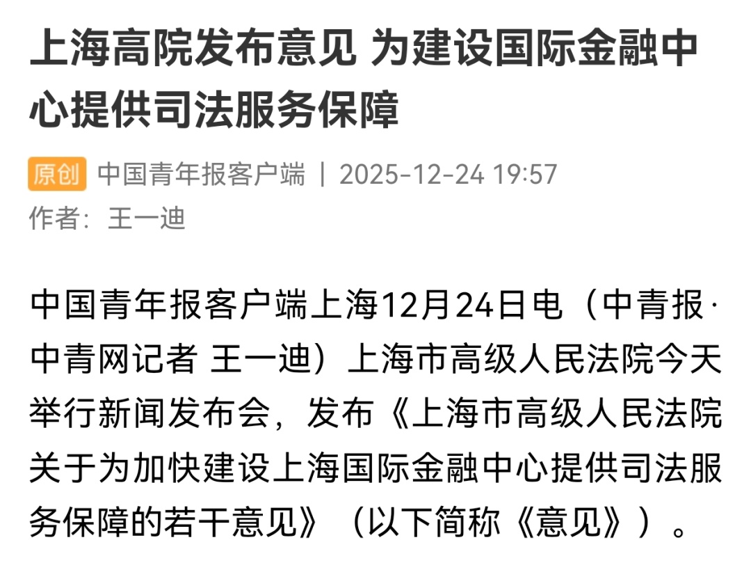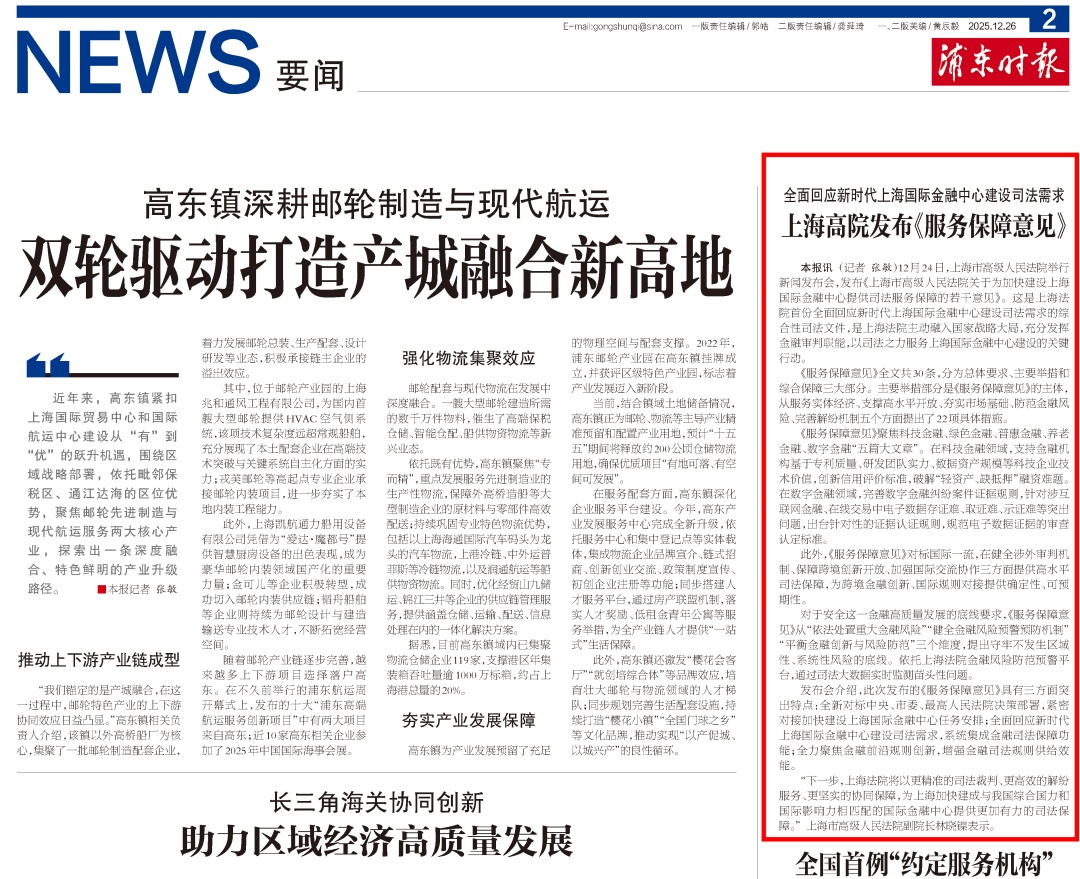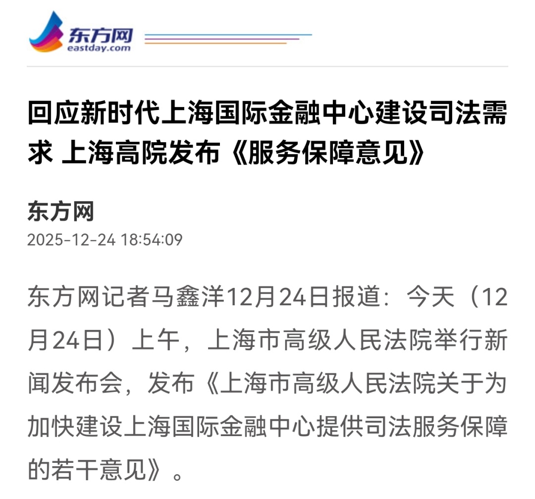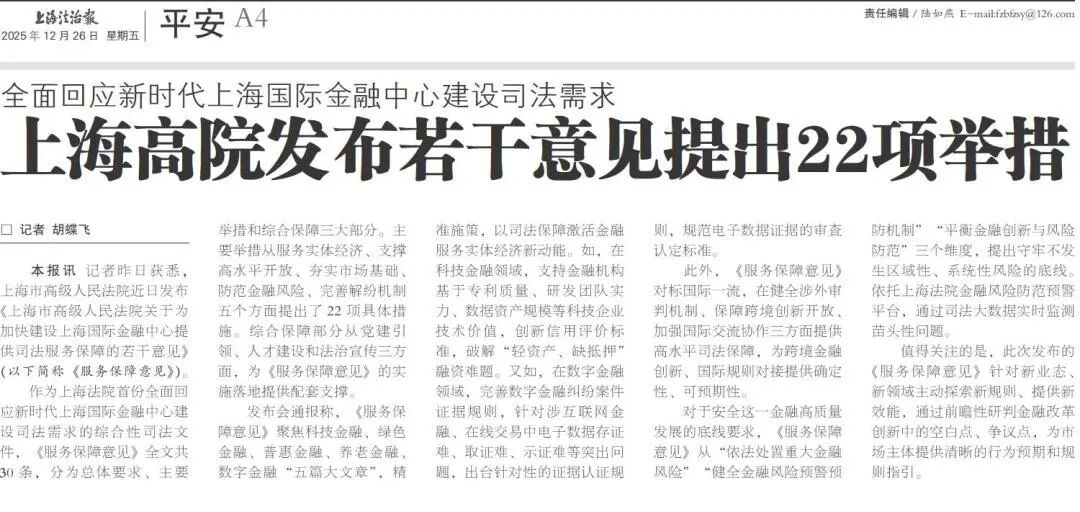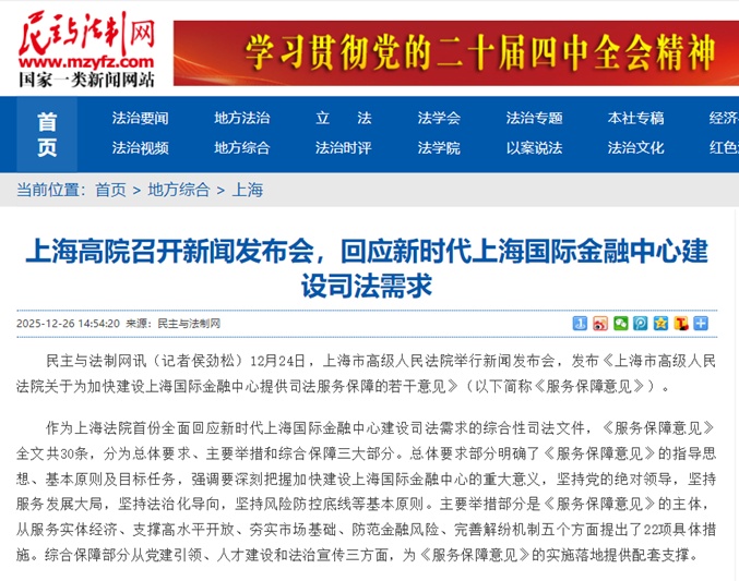 近日,上海市高级人民法院举行《上海市高级人民法院关于为加快建设上海国际金融中心提供司法服务保障的若干意见》新闻发布会( 点击查看详情),致力于为加快建设上海国际金融中心提供高质量司法服务保障。本次发布会引发社会广泛关注和媒体多维度报道,现将部分报道予以摘编。