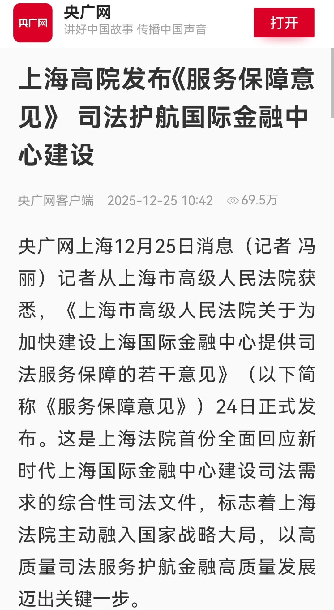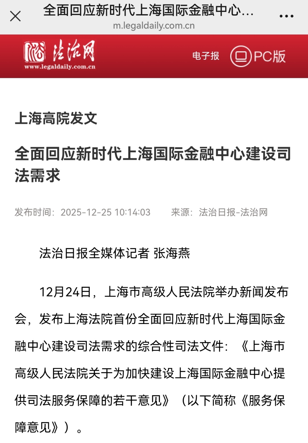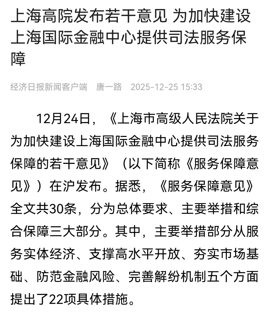 近日,上海市高级人民法院举行《上海市高级人民法院关于为加快建设上海国际金融中心提供司法服务保障的若干意见》新闻发布会( 点击查看详情),致力于为加快建设上海国际金融中心提供高质量司法服务保障。本次发布会引发社会广泛关注和媒体多维度报道,现将部分报道予以摘编。