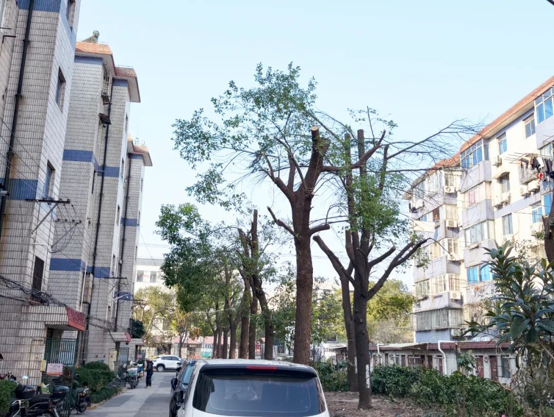 为最大限度减少对居民日常生活的影响,物业公司采用“一天修剪一排树”的精细化作业模式,提前发布施工通知,引导居民挪车,并在现场设置醒目施工提示牌。专业修剪人员对小区内60棵高大树木进行科学规范修剪,同步清理绿化带内杂乱灌木,既改善了采光条件,又提升了小区环境整洁度。