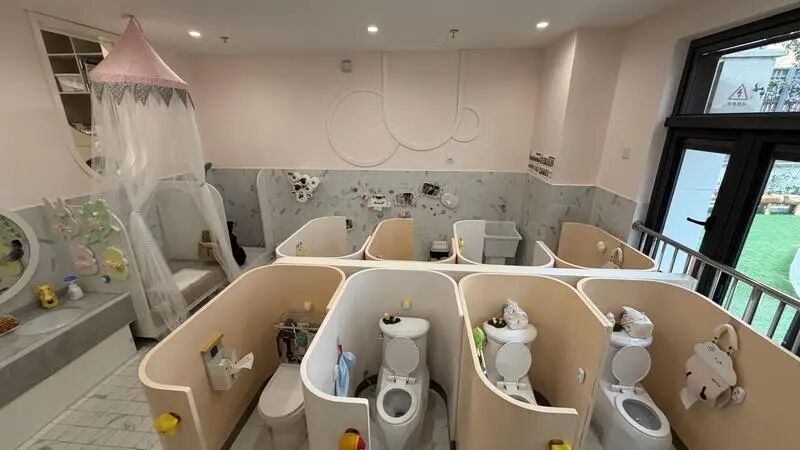 幼儿园还在生活细节中融入成长支持,尤其注重孩子自理能力的自然养成: 设置温暖私密的“换尿布区”,配有儿童矮凳、物品篮与全身镜,鼓励孩子在成人陪伴下学习自我整理;厕所采用半包隔断设计,既保护如厕隐私,又便于教师看护;每个孩子拥有专属“宝贝箱”,收纳个人小物件,在日常中建立秩序感与自我管理意识。