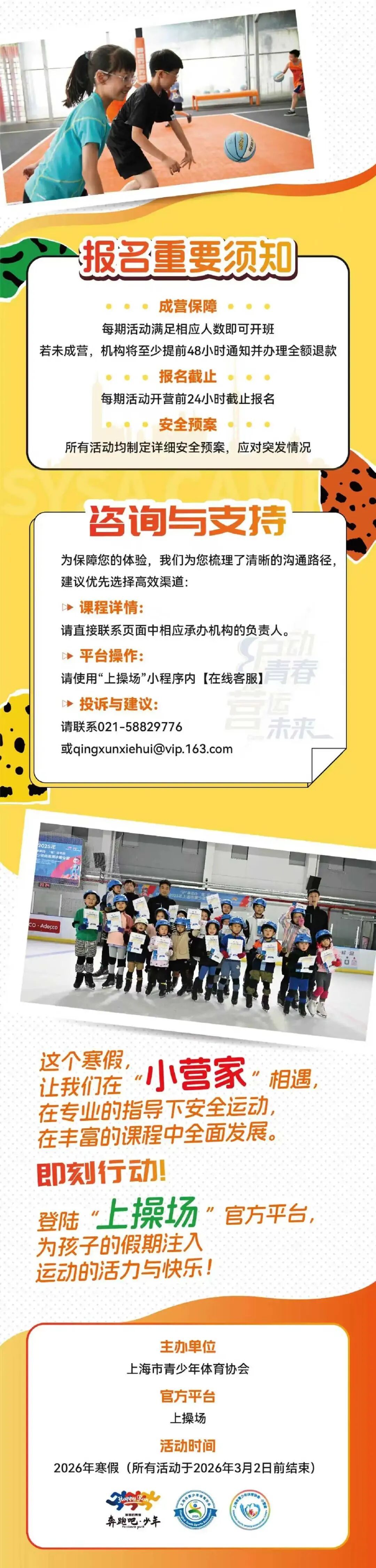 2026年“沪”动青春·“营”运未来上海市青少年体育协会“小营家”冬令营现已启动报名。这个冬天在丰富的课程中体验运动之乐,激发潜能,蓄力未来,奔赴更棒的自己!(微信搜索“上操场”小程序,进入“小营家”活动专区,即可报名。)