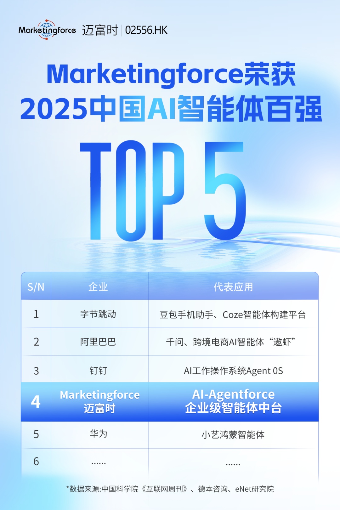 近日,由中国科学院《互联网周刊》、德本咨询、eNet研究院联合发布的《2025中国AI智能体百强》榜单揭晓。静安区科技企业迈富时凭借全新升级的AI-Agentforce智能体中台3.0及全链路全场景智能体应用成果,成功跻身榜单第四名,与字节跳动、阿里巴巴、华为等行业头部厂商同列,彰显了静安区在AI SaaS领域培育优质企业、构建科创生态的显著成效。