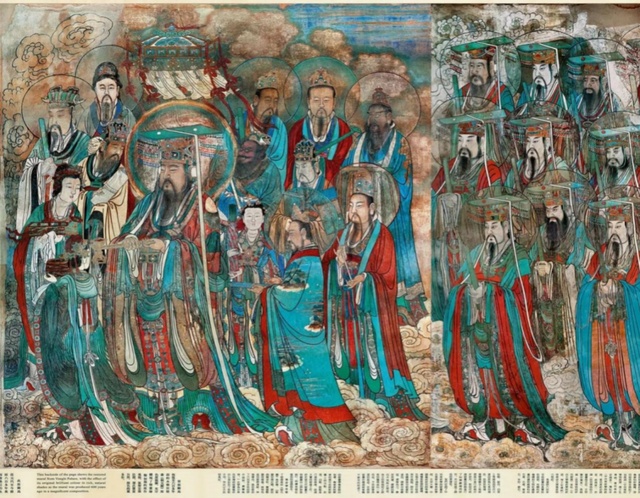 壁画主要分布在三清殿、纯阳殿、重阳殿,其中艺术成就最高的当数三清殿内的《朝元图》。这幅长97米、高4.4米的巅峰之作,描绘了道家诸神朝拜元始天尊的盛大场景。画中290位神祇分列东西,以八位主神为中心,构图严谨平衡,衣冠服饰、面容神态无一雷同,堪称中国古代人物画的巅峰。