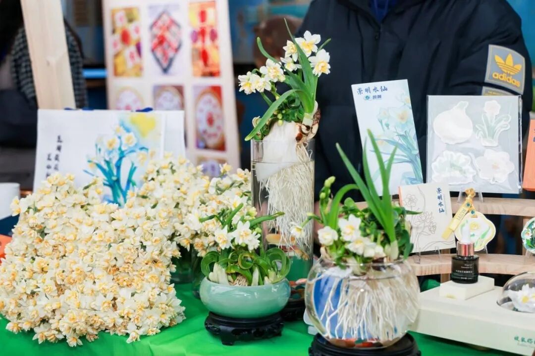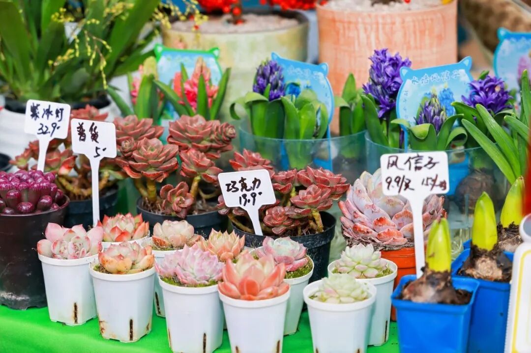 鲜花摊位是市集里的“颜值担当”,各色年宵花竞相绽放,将新年的喜庆氛围拉满。崇明水仙亭亭玉立,散发着淡雅清香;云间卉谷的朱顶红花朵硕大饱满。宝山一水间生态花卉带来的多肉植物、金黄的腊梅、饱满的银柳等花卉错落摆放,色彩艳丽、生机盎然,每一束都承载着 “吉祥如意”“富贵安康” 的美好祝愿。