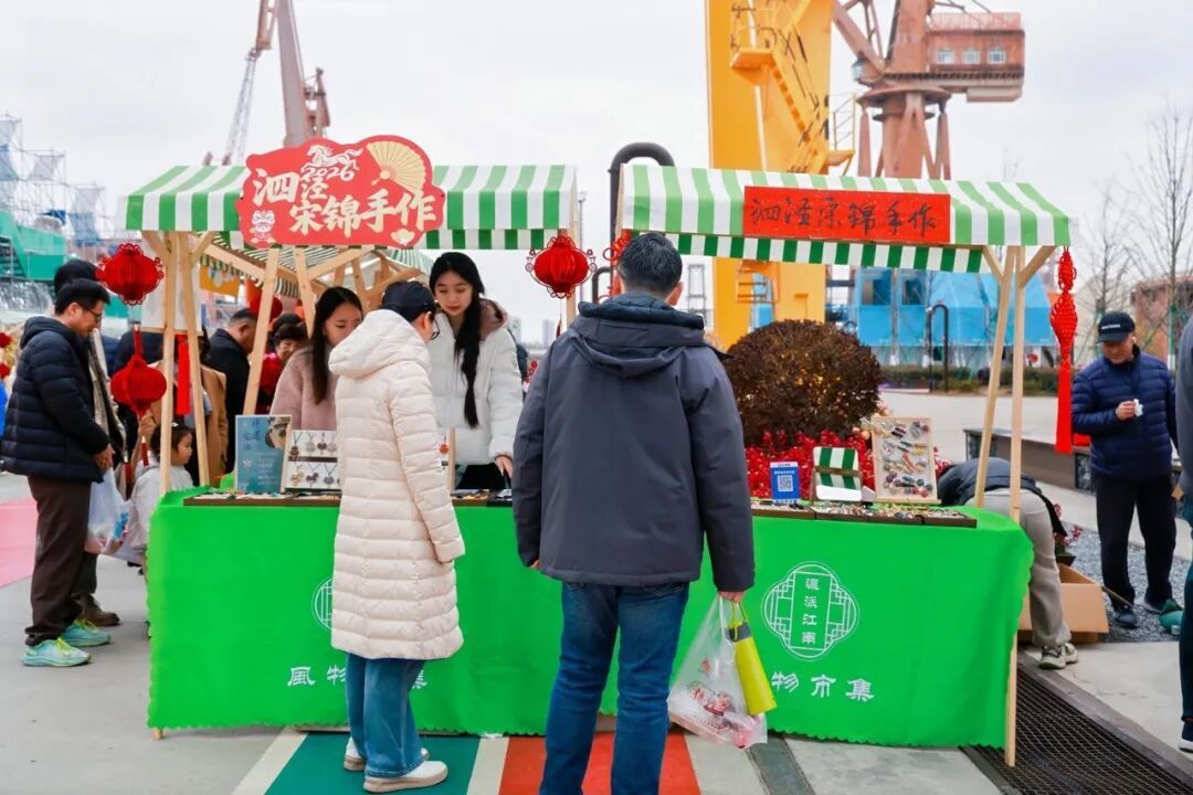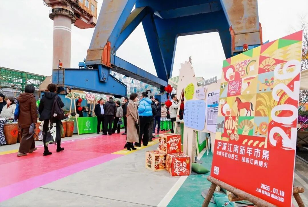 1月18日,“沪派江南复兴市集”(第九期)新年大集在船台公园集结开场。工业遗存与江南雅韵相拥,市井烟火与非遗文脉共生,地道风味与新春喜色交融,历史肌理与市集的鲜活气息碰撞,为市民呈现了一场非遗赋能、烟火满溢、风味十足的新春喜庆盛宴。市集当天一早人头攒动、笑语盈盈,上海九个涉农区的优质好物、热气腾腾的美食、匠心独运的手作、精彩纷呈的民俗表演,让每一位到访者都沉浸在沪派江南的独特魅力与年货集市的烟火气之中。