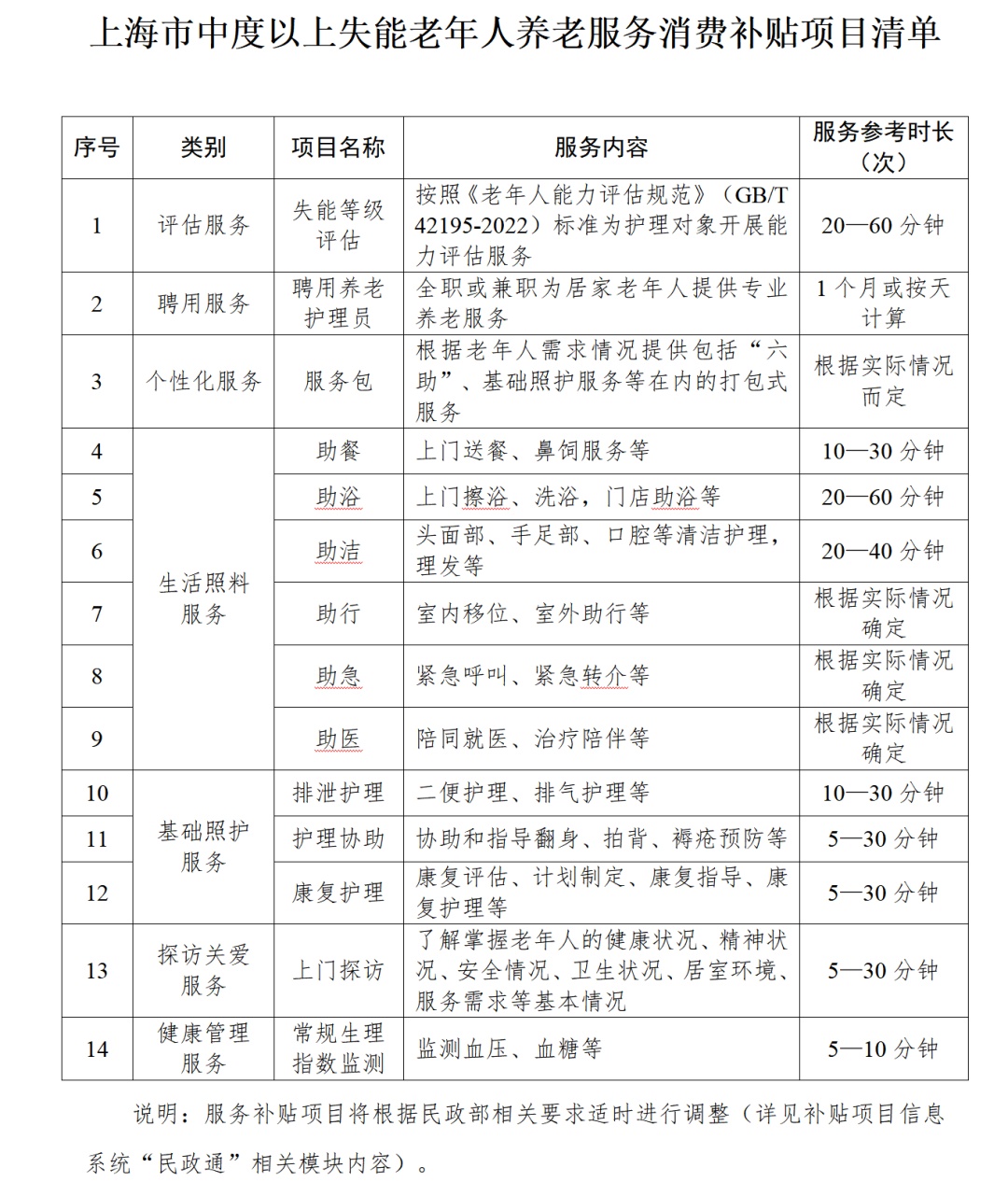 为更好落实《民政部 财政部关于实施向中度以上失能老年人发放养老服务消费补贴项目的通知》《上海市提振消费专项行动方案》等文件精神,提高失能老年人生活质量,减轻家庭照护压力,促进养老服务消费,将落实开展针对我市中度以上失能老年人养老服务消费补贴发放工作,具体通知如下: