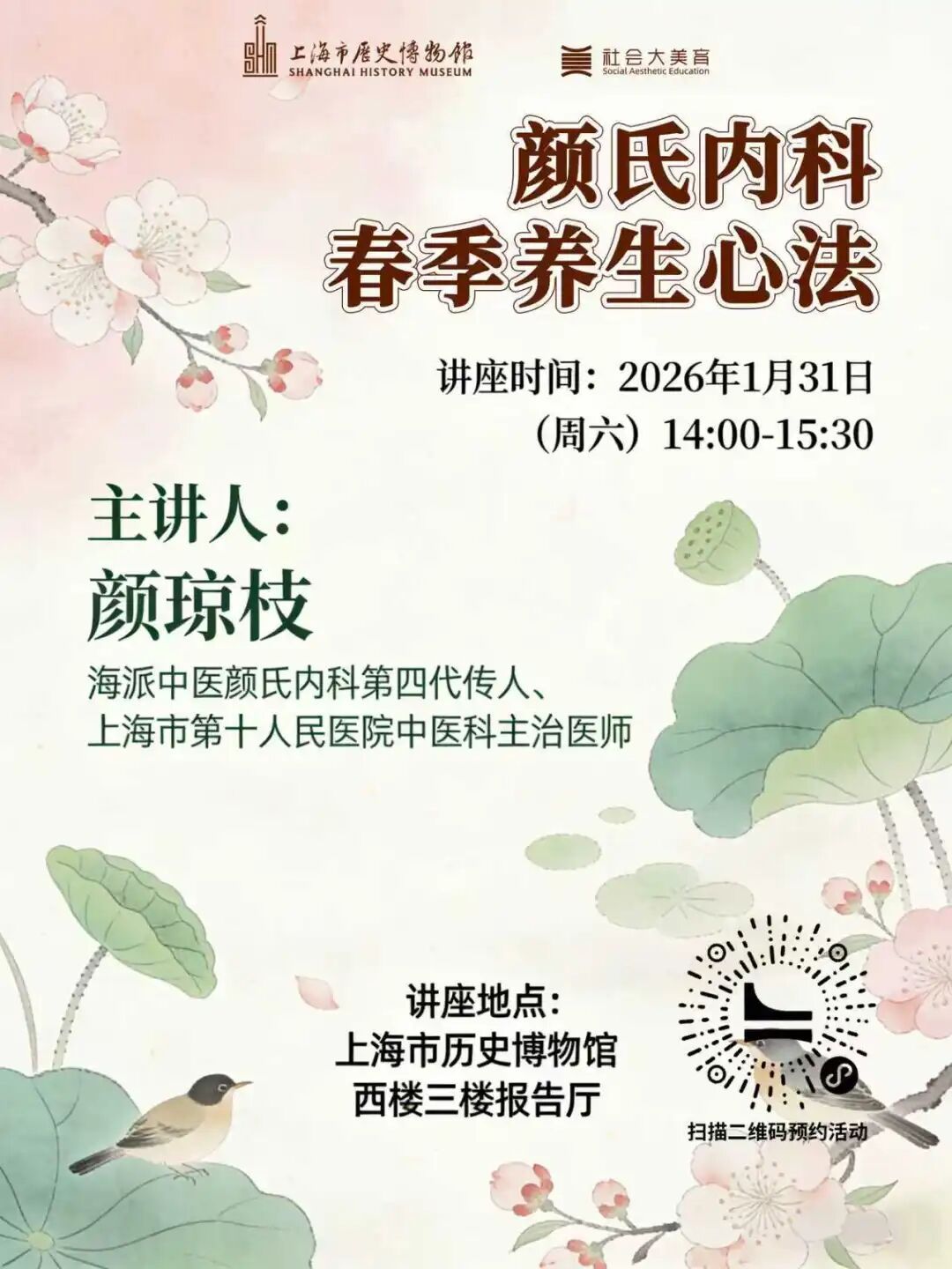 本次讲座特邀海派中医颜氏内科第四代传人颜琼枝医师,从颜氏内科的起源出发,讲述其跨越百年的传承与发展。并围绕春季情志、起居、运动、饮食等养生心法展开,为大家解码海派中医的非遗智慧。
