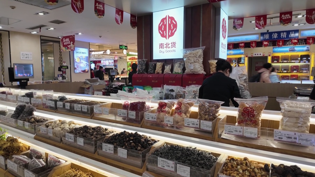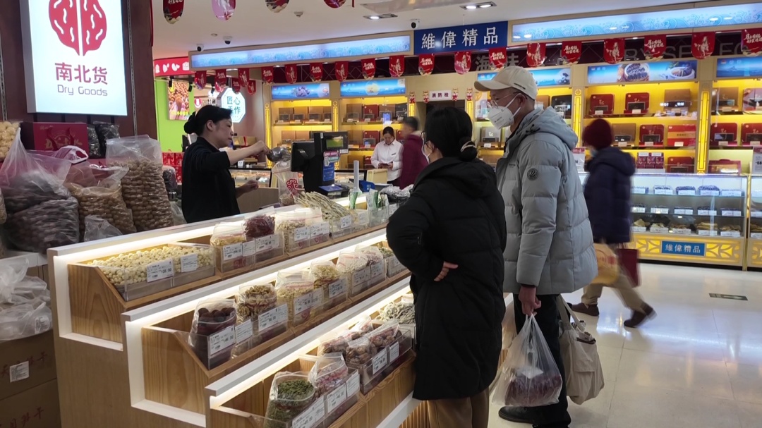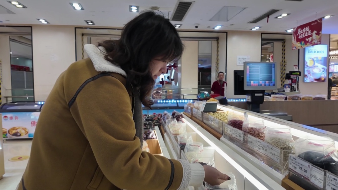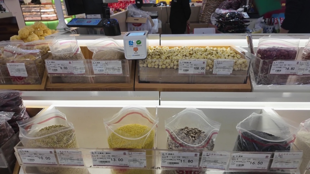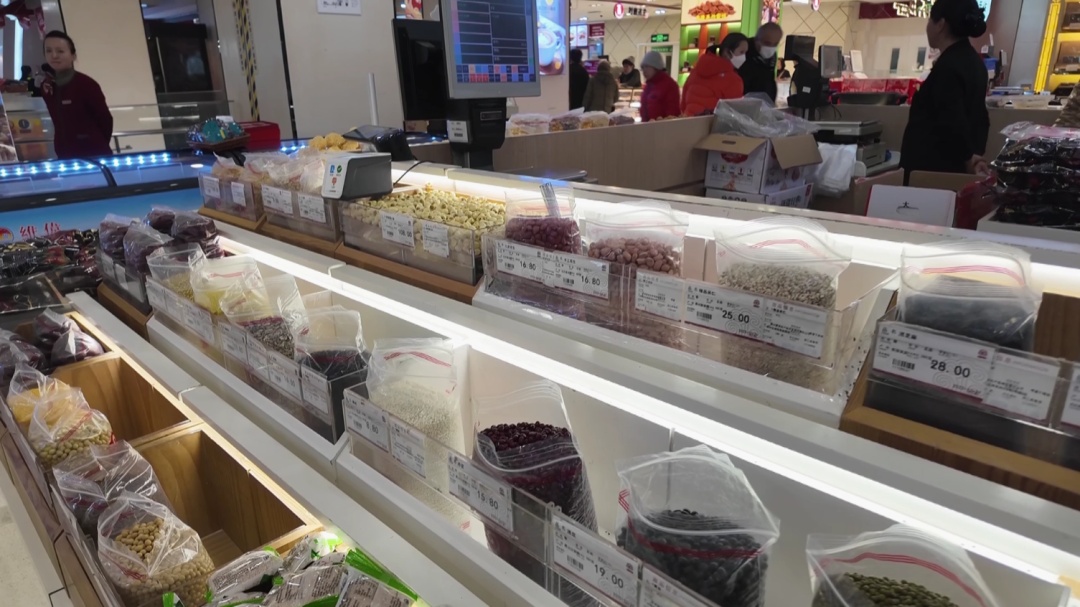 在南京路上的食品一店,五谷杂粮柜台宛如一个充满年味的小世界,货品琳琅满目,二十多个品种整齐有序地码放着。圆硕饱满的红枣似玛瑙般诱人,颗粒饱满的红豆散发着质朴的气息,晶莹剔透的糯米在灯光下闪烁着柔和的光泽。不断有市民前来选购,他们穿梭在货架之间,精心挑选着心仪的食材,为熬制那一锅充满爱意的腊八粥做准备。