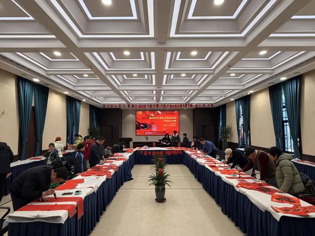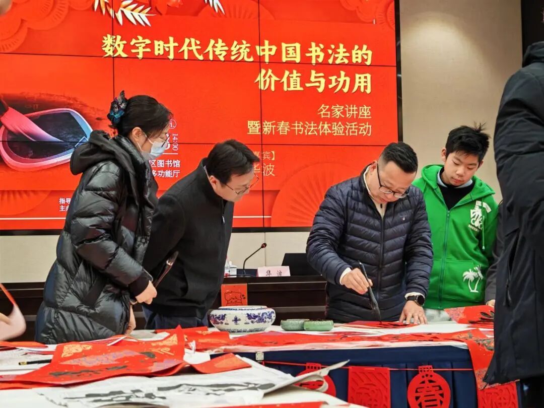 在讲座之外,现场也开展了“写福迎春”的实践环节。在华波老师的指导下,读者们凝神静气,笔走龙蛇;相互交流,笑语盈盈。墨香与纸韵交织,一幅幅承载着个人心意与新年祈愿的“福”字和春联在笔端诞生。活动最后,读者们纷纷展示自己的墨宝,现场洋溢着浓厚的节日气氛与收获的喜悦。