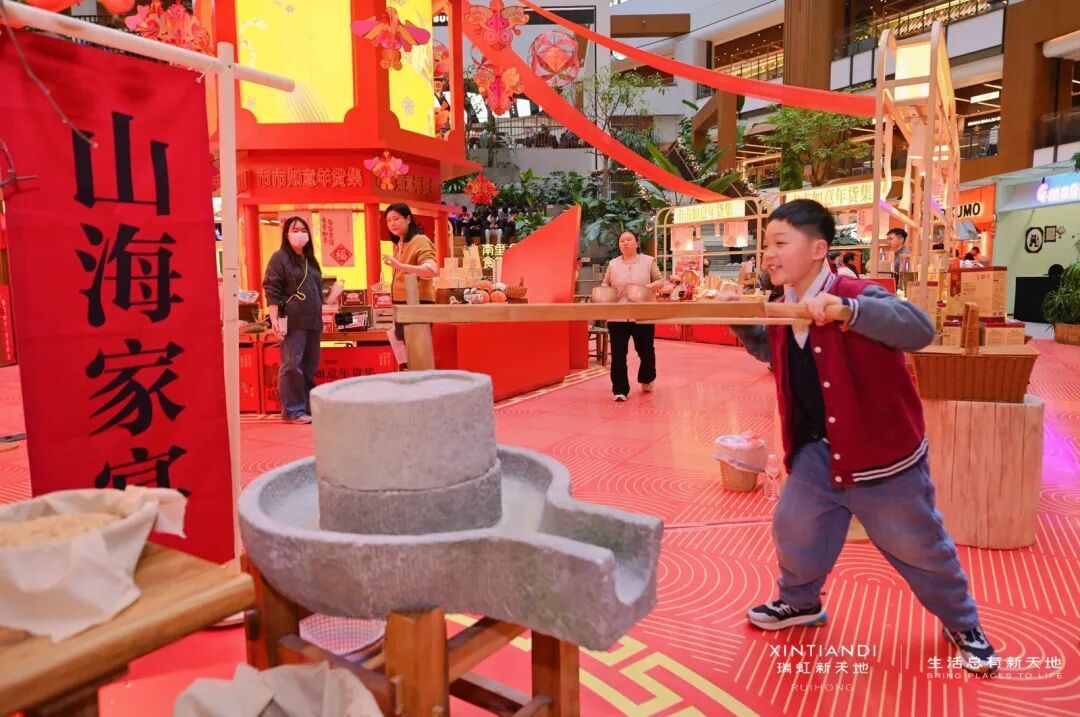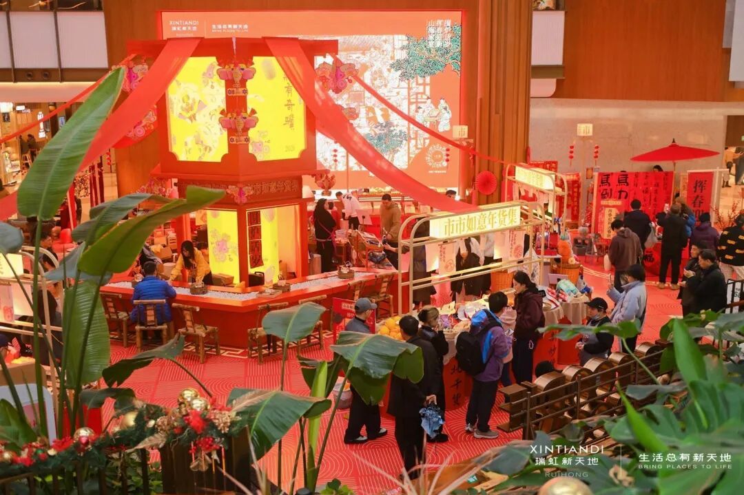 1月30日,瑞虹新天地太阳宫五楼中庭,“市市如意年货集”现场人头攒动。从1月30日一直到3月3日,瑞虹新天地通过两大主题市集、非遗手作和民俗表演,把传统年俗变成了可逛可玩的消费新体验。