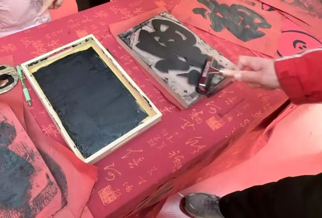 现场的文化体验活动同样丰富,融合传统技艺与现代设计的上海市非遗药斑布摊位,吸引了众多市民驻足欣赏。一旁的拓印“福”字体验区颇受欢迎,参与者将颜料均匀刷于雕版,覆上红纸,再用拓包仔细按压,揭起时一个清晰的“福”字便跃然纸上。现场更有手动打谷机和传统石磨可以现场体验传统年味。
