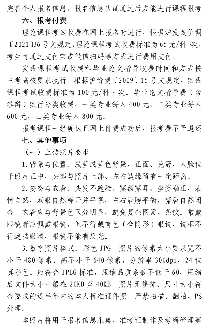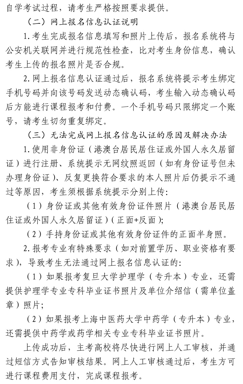 特殊类型考生(身份信息未通过系统自动验证的考生、报考专业需要提交纸质证明材料的考生等)信息审核采用网上人工审核方式,具体流程按“报名平台”提示操作。理论课程考试付费在网上报名时进行,实践课程考试付费和毕业论文指导费付费的时间和方式按主考高校要求执行,在规定时间内未完成付费的,其报考视为无效。报考课程一经确认且网上付费成功后,报考费不予退还。