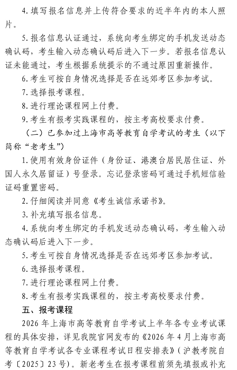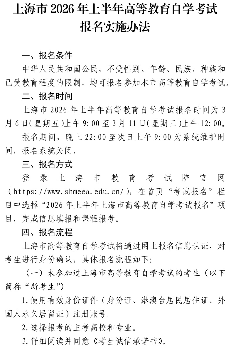 考生可于3月6日(星期五)上午9:00至3月11日(星期三)中午12:00,登录上海市教育考试院官网(https://www.shmeea.edu.cn/),在首页“考试报名”栏目中选择“2026年上半年上海市高等教育自学考试报名”项目进行网上报名。报名期间,22:00至次日上午9:00为系统维护时间,报名系统关闭。
