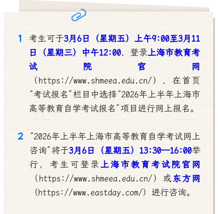 由上海市教育考试院主办、东方网协办的“2026年上半年上海市高等教育自学考试网上咨询”将于3月6日(星期五)13:30—16:00举行。届时,上海市教育考试院将组织本市17所主考高校集中举行网上咨询,考生可登录上海市教育考试院官网(https://www.shmeea.edu.cn/)或东方网(https://www.eastday.com/)进行咨询。