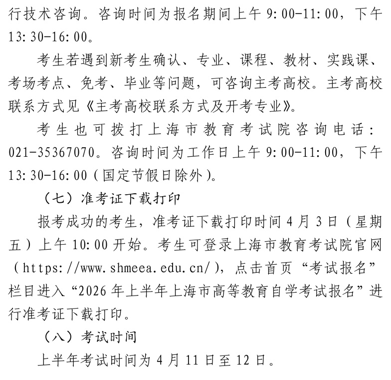 市教育考试院介绍,上海市2026年上半年高等教育自学考试将于4月11日至12日举行。详见↓