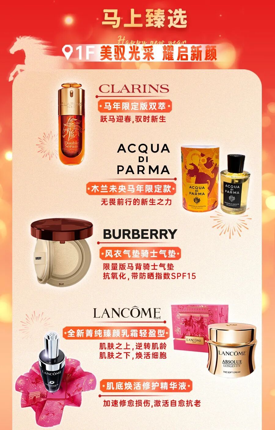 美妆品牌 娇韵诗、帕尔玛之水、Burberry、兰蔻等推出马年限定款,以精致臻礼开启新年光彩。