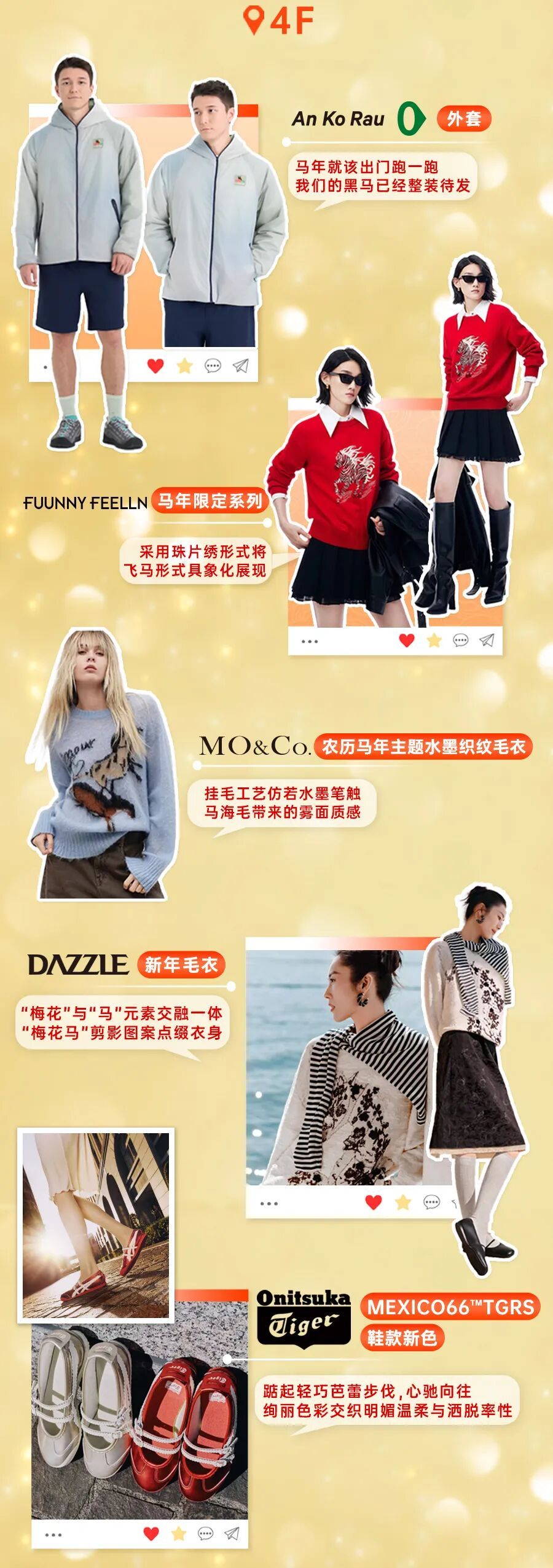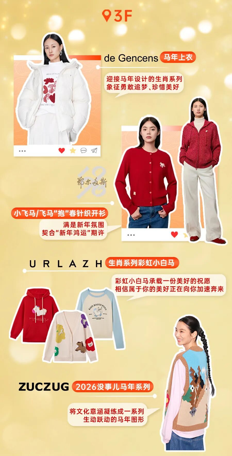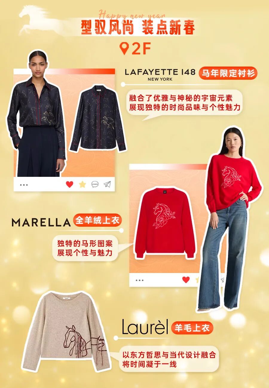 时尚服饰 LAFAYETTE 148、MARELLA、Laurèl、de Gencens、FILA等品牌推出马年主题上衣、套装,融合生肖元素与当代设计,诠释优雅与活力。