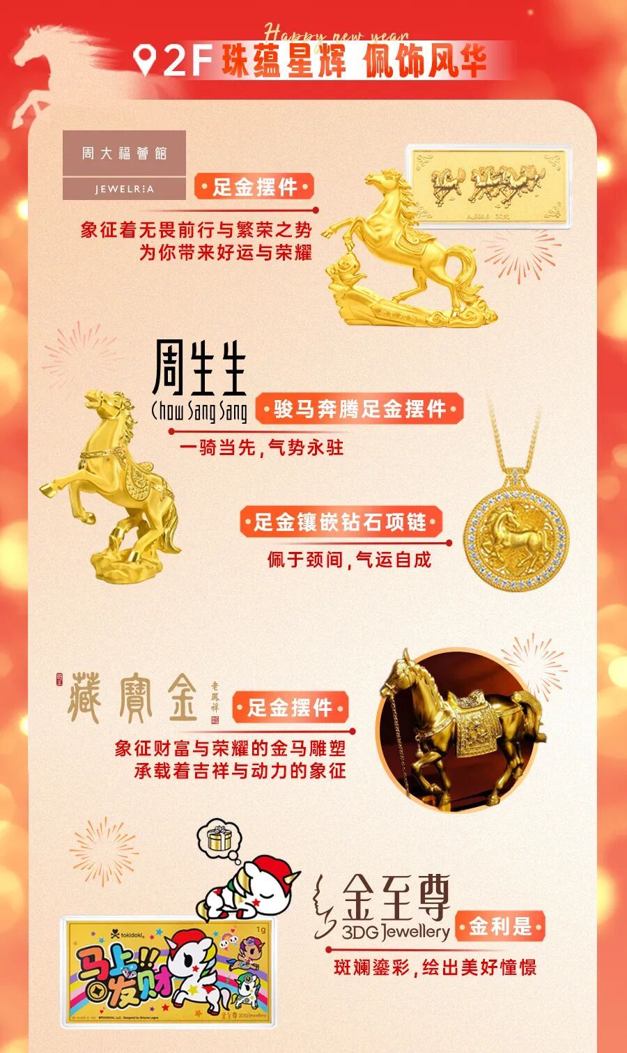 黄金珠宝 周大福荟馆、周生生、金至尊等呈现生肖金饰与贺岁系列,寓意吉祥,有珍藏价值。