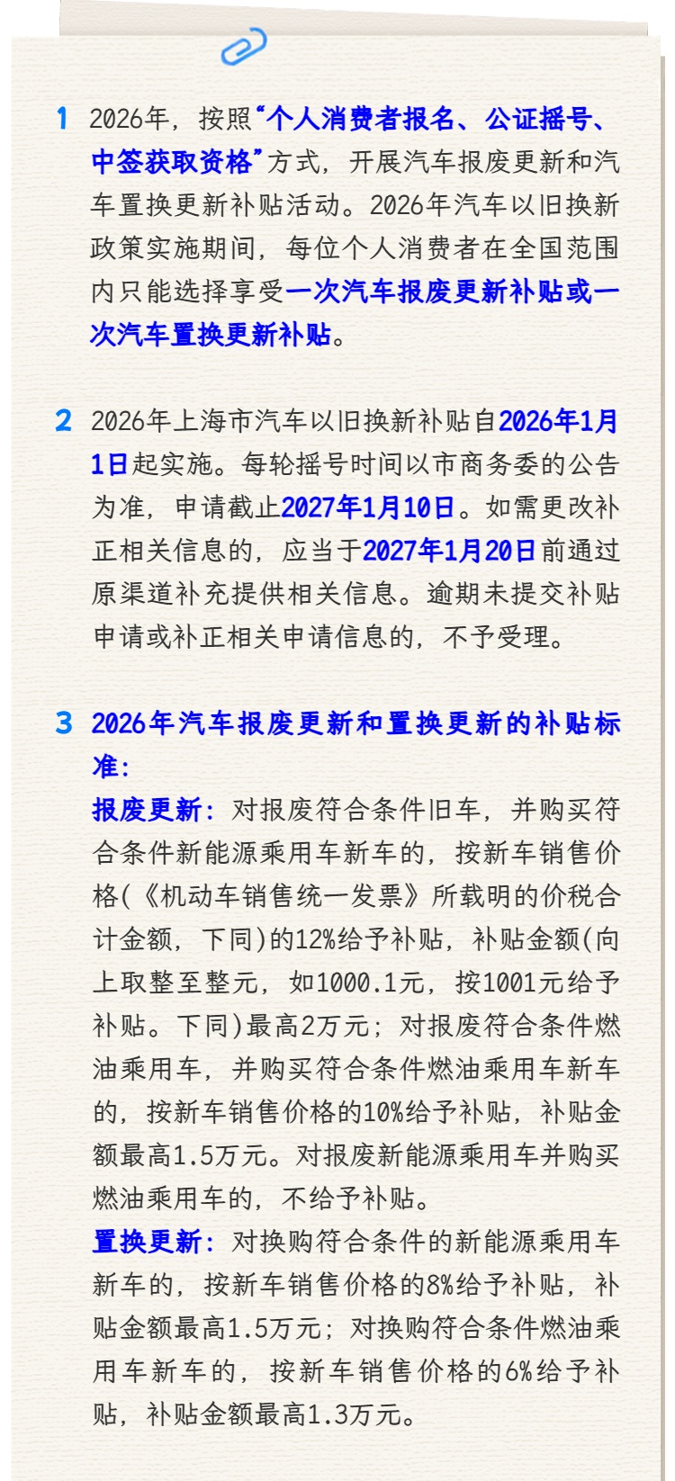 市商务委介绍,《2026年上海市汽车以旧换新补贴政策实施细则》出台,为个人消费者提供