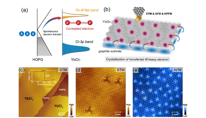 在不依赖极端条件、且避免探针扰动的情况下,直接原子尺度观测维格纳晶体的形成与有序电子排列仍然是一个尚未解决的科学问题。2025年12月23日,复旦大学物理学系高春雷课题组和沈健/殷立峰课题组合作,利用全新的“电荷转移-电子结晶”策略,将具有重电子、极平带、强关联特性的稀土4f二维单层YbCl3与HOPG构筑异质结,利用电荷转移将电子注入Yb的4f轨道平带,实现了本征的维格纳晶体。在此基础上,利用高灵敏度的Q-plus 原子力显微镜(AFM)实现了维格纳晶体的亚原子级成像。相关研究成果以“Intrinsic Heavy Wigner Crystal Forged by Transferred 4f Electrons”为题,发表于Physical Review Letters。