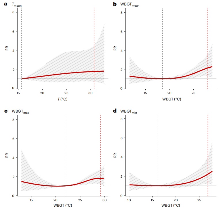 图:上海地区(a)日平均气温、(b)日平均湿球黑球温度(WBGT)、(c)日最高WBGT及(d)日最低WBGT与精神行为障碍(MBDs)住院病例的暴露-响应关联曲线。