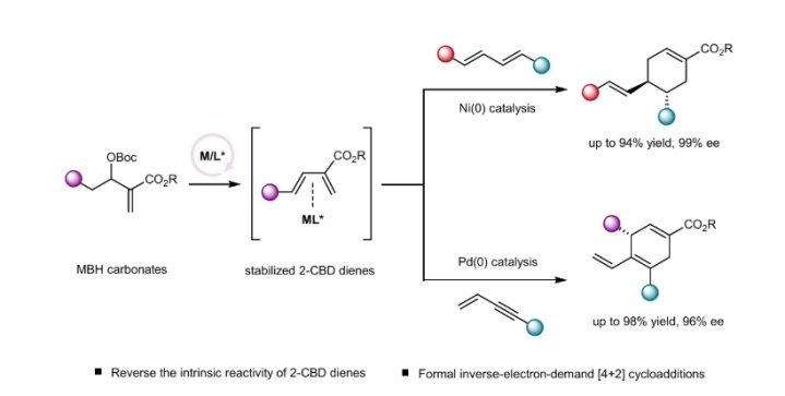 研究团队利用简单易得的Morita–Baylis–Hillman碳酸酯为双烯前体,在Ni(0)/手性单膦配合物催化下,原位生成不稳定2-酯基-1,3-丁二烯,利用低价镍金属催化剂的配位作用,或是钯催化体系,实现一系列对位取代环己烯类衍生物以及多取代手性1,4-环己二烯衍生物的高效合成。