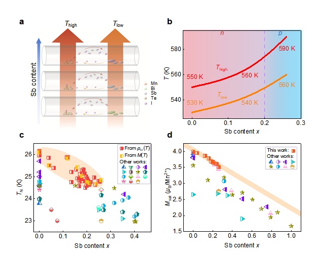 图(a)-(b) OCVT生长方案的示意图及温区设置;(c)-(d) OCVT方法制备的Mn(Bi1-xSbx)2Te4晶体与文献中常规生长方法所得晶体的磁学性质对比(奈尔温度TN和饱和磁化强度Msat)